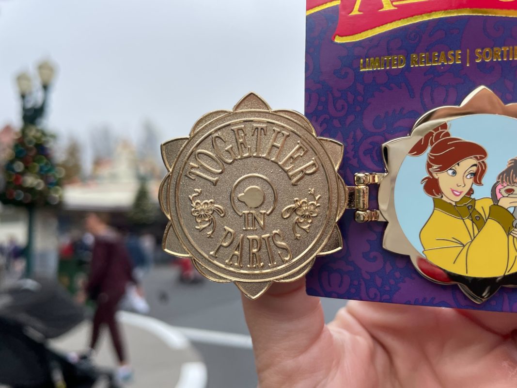 The pin opens to show “Together In Paris” engraved on one side and a picture of Anastasia and her puppy, Pooka, on the other.