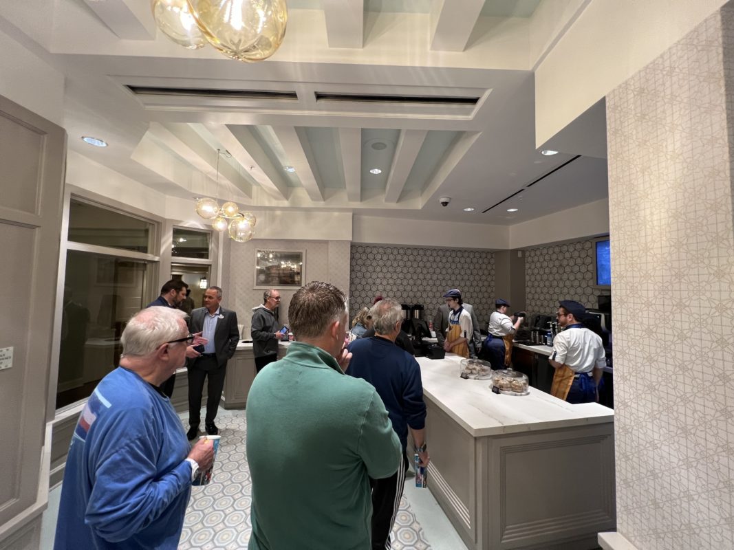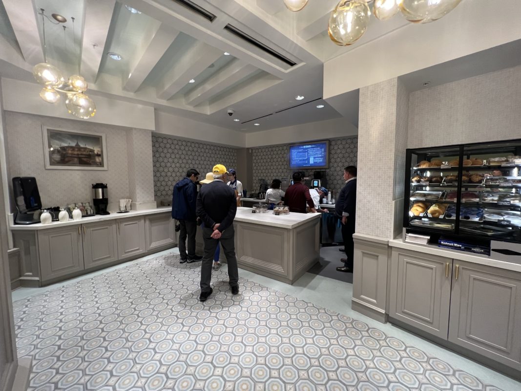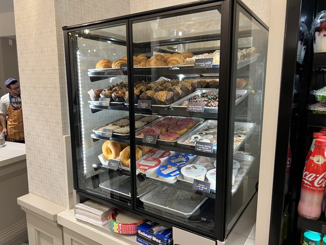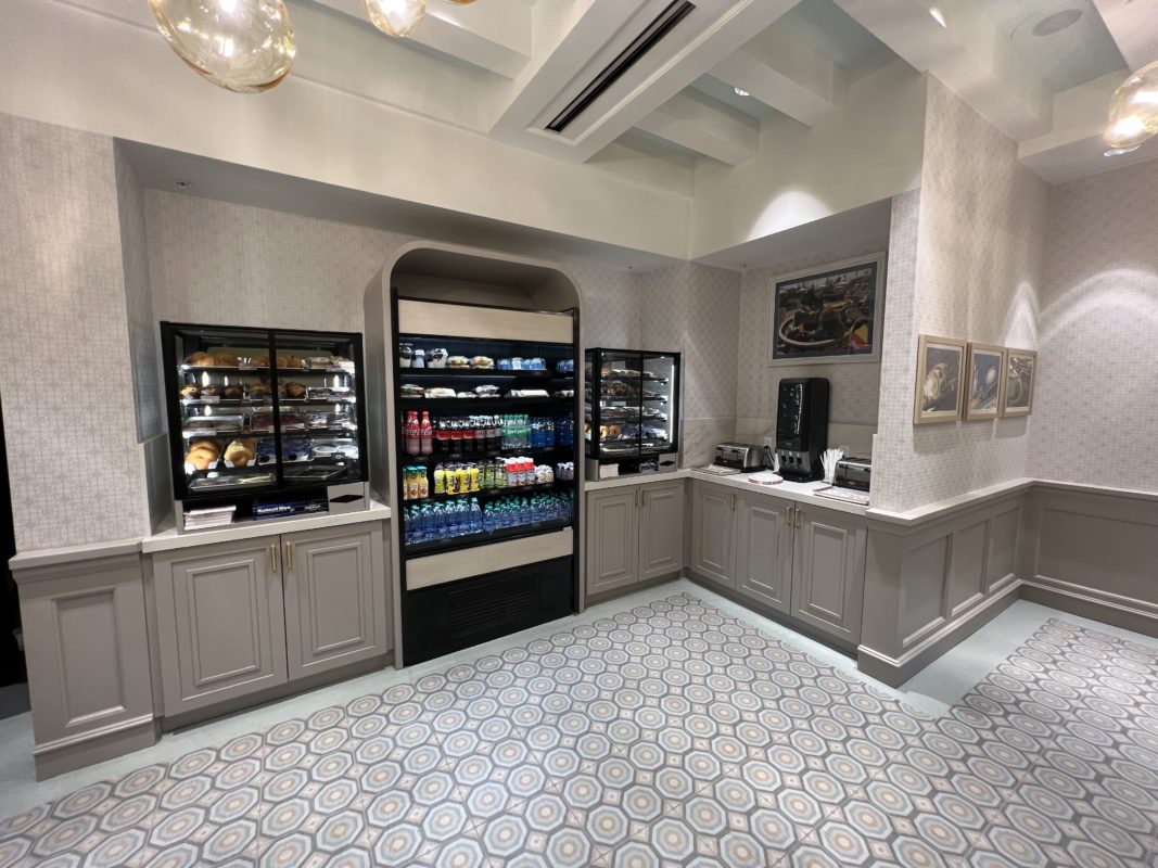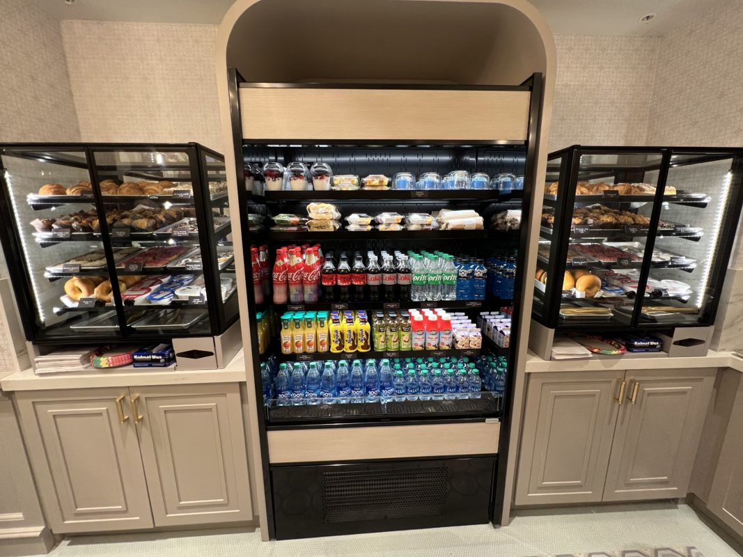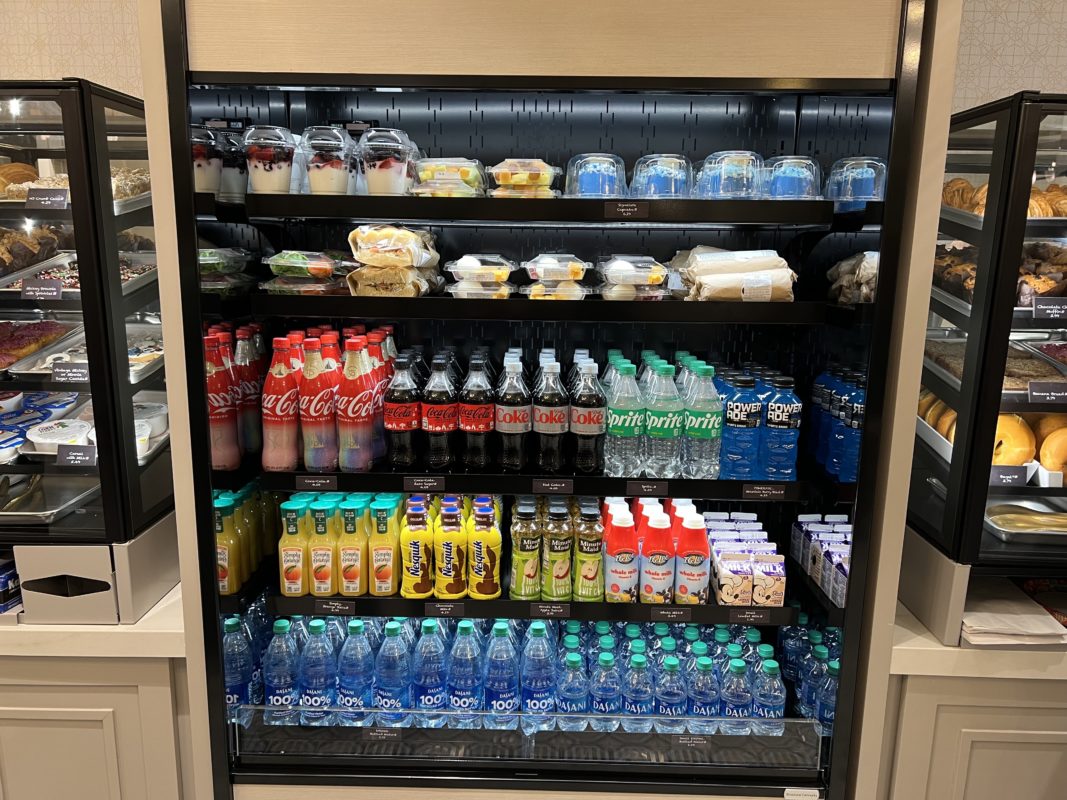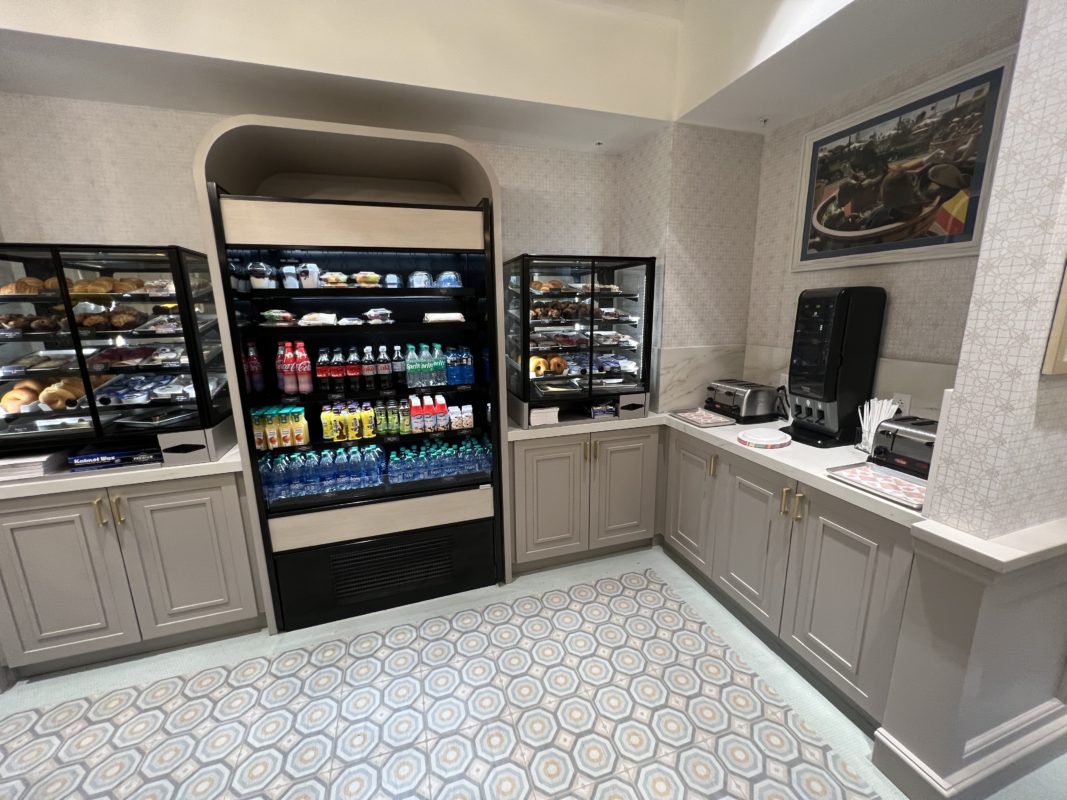 On one side is a grab-and-go station with assorted pastries, parfaits, snacks, and assorted beverages.