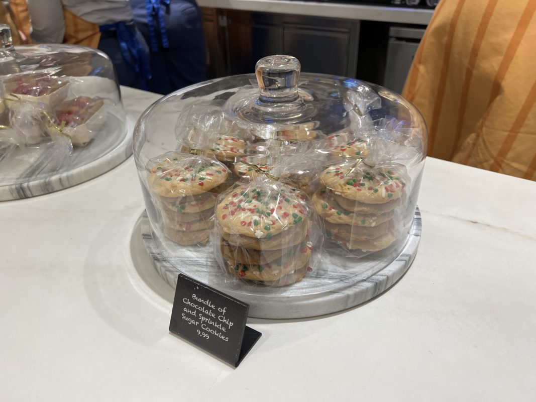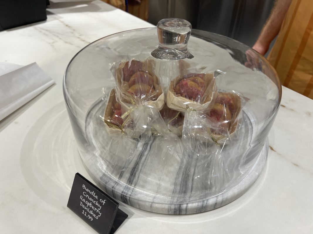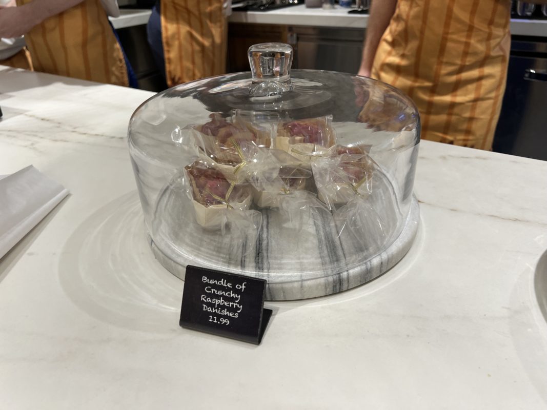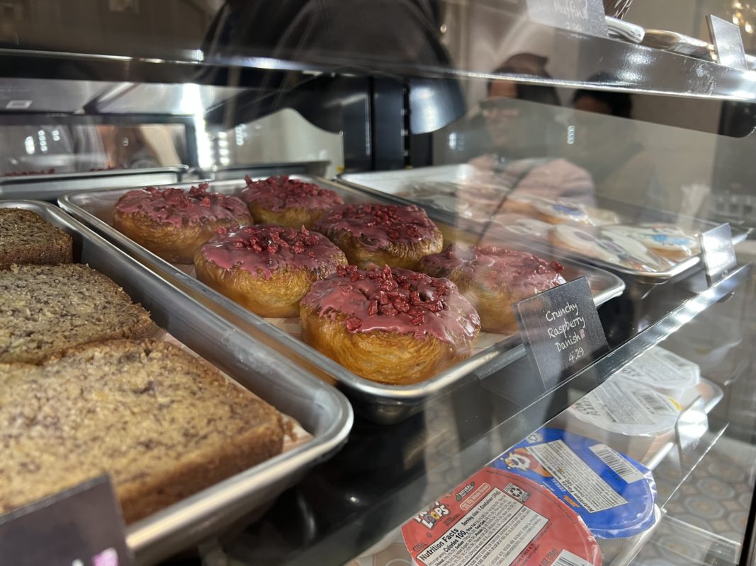 The pastry case has an assortment of snacks and breakfast items including their signature crunchy raspberry danish, vintage Mickey and Minnie sugar cookies, as well as assorted cereals.