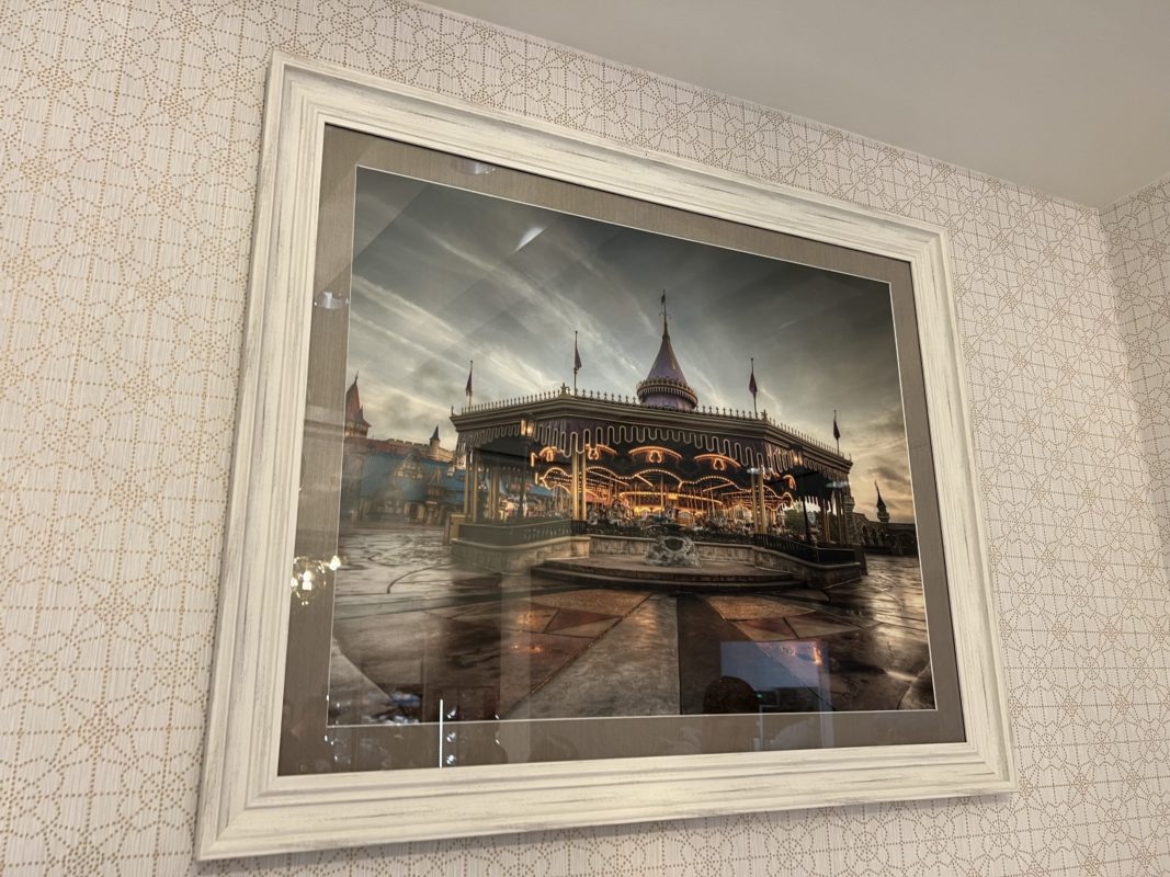 Hanging over a second condiment station is another photograph of a Magic Kingdom attraction. This is of Prince Charming Regal Carrousel.