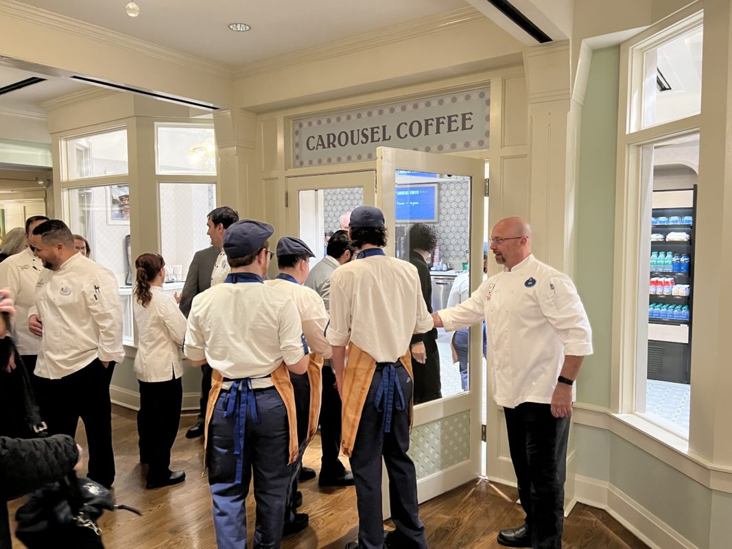 The Cast Members gathered outside Carousel Coffee for an official ribbon cutting before the new quick serve location opened.