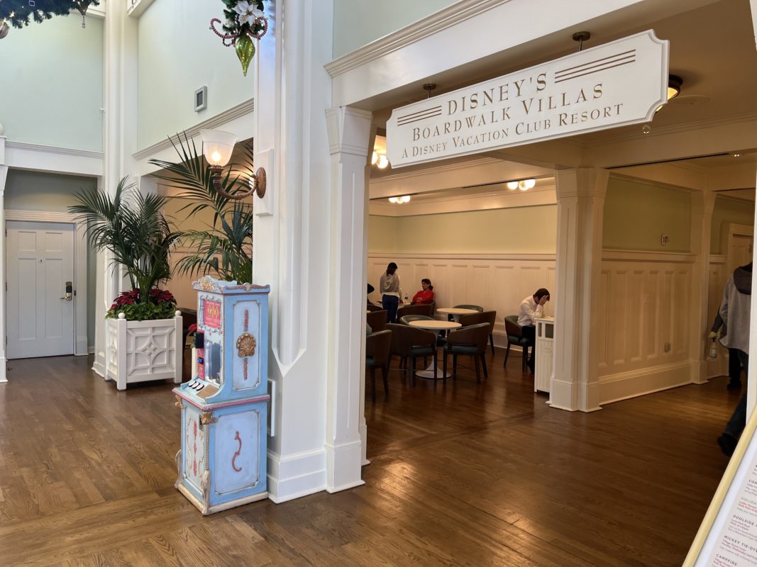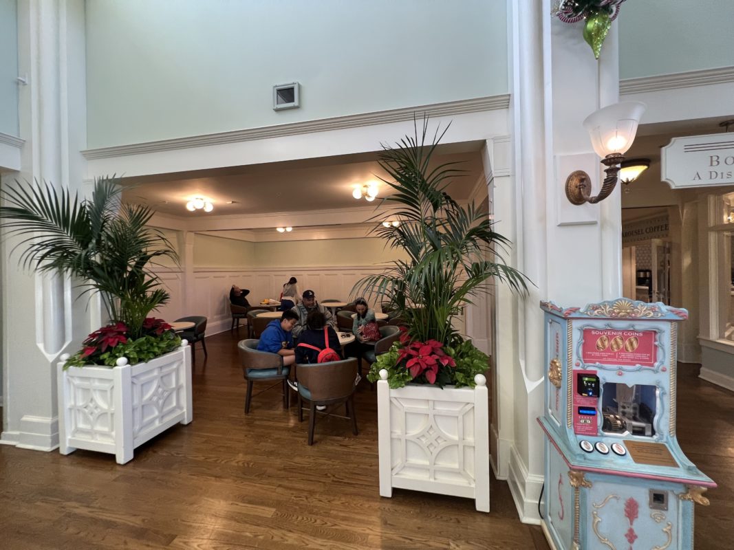 The new Carousel Coffee shop at Disney’s BoardWalk Inn is open, along with the seating area that opened yesterday. It’s located in the lobby, replacing Dundy’s Sundries, which closed permanently in October.