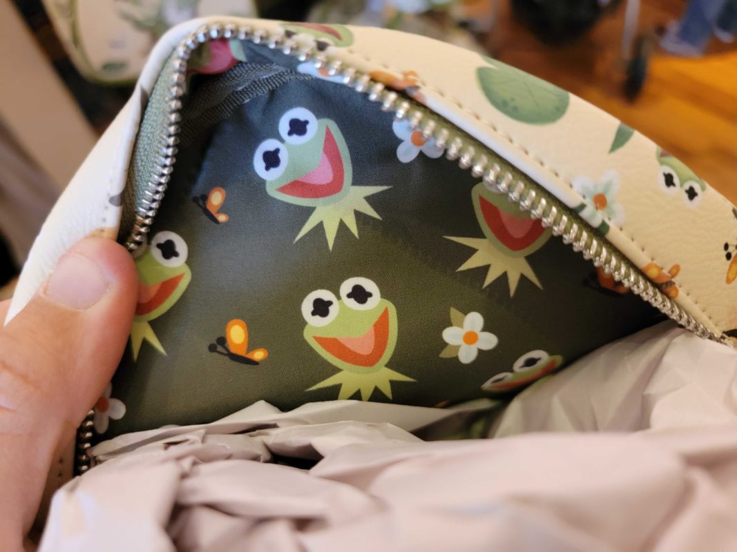 The interior lining has a black background and features pictures of Kermit’s face, flowers, and butterflies.