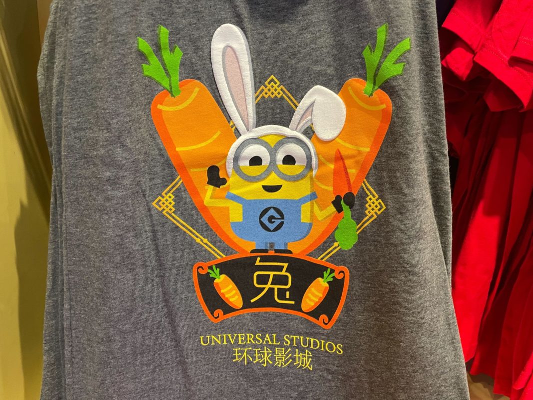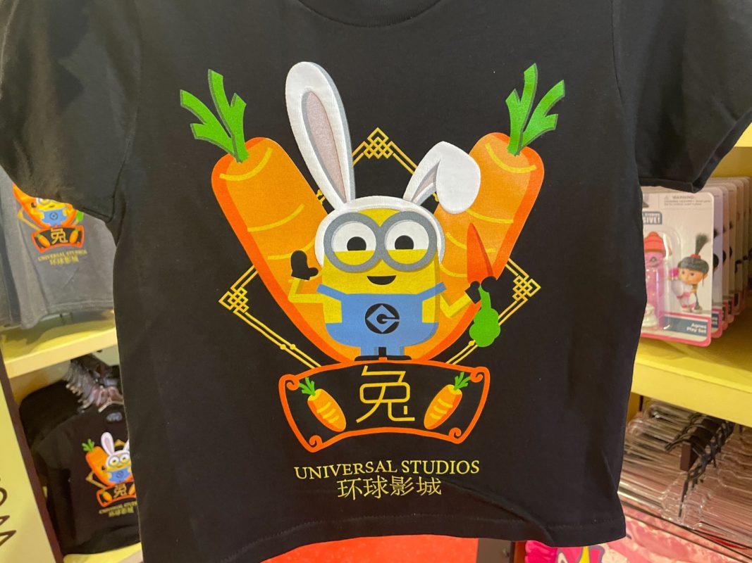 There’s no question that this Minion is ready to welcome in 2023 as the “Year of the Rabbit”. An orange ribbon frame at the bottom of the t-shirt features the Mandarin symbol for “Rabbit” flanked by two more orange carrots on either side.