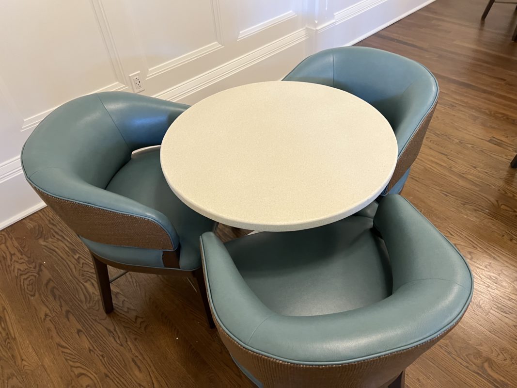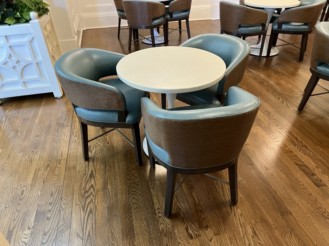 The seating area features round cocktail tables, each surrounded by three tub-style chairs. There is also a white trash can receptacle adorned with white bead board and the logo of Disney’s BoardWalk Resort carved into the front.