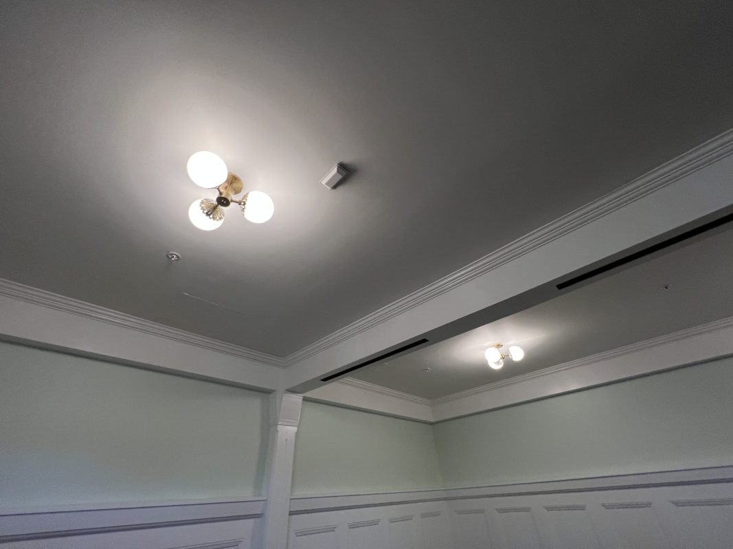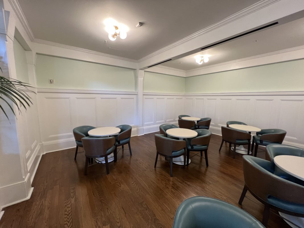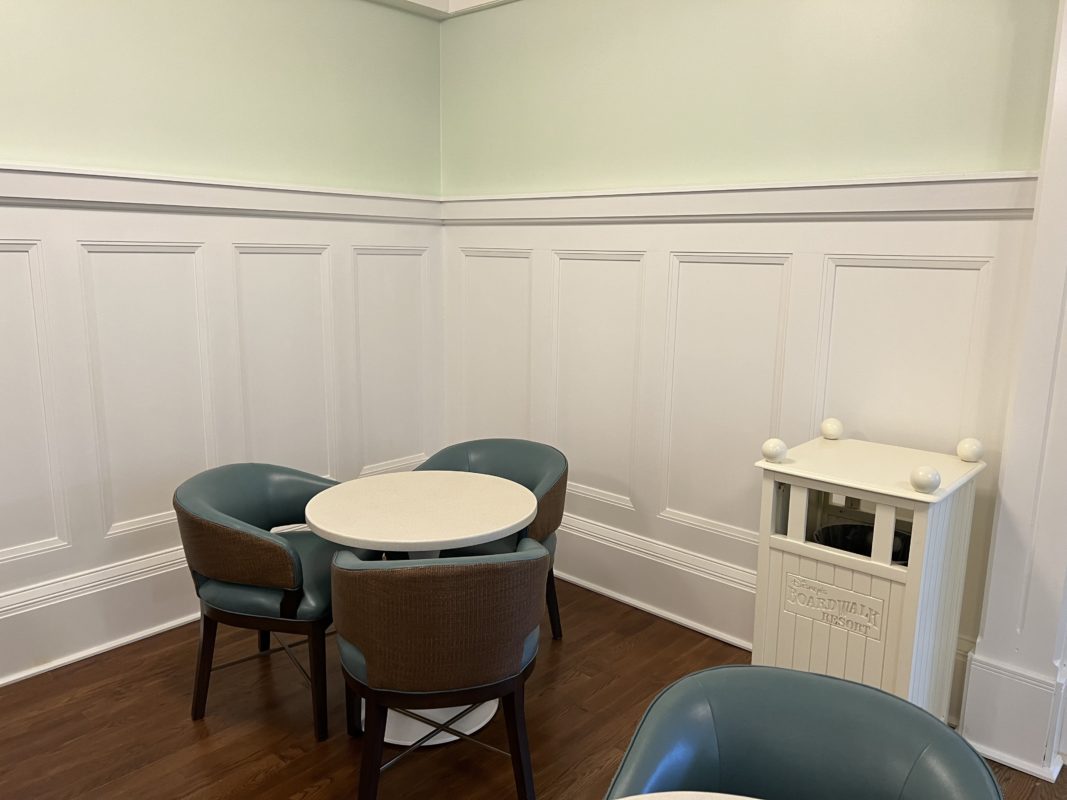 The new seating area has a sterile appearance, with white paneled wainscoting covering three-fourths of the walls and the upper quarter painted in a soft mint green color. The ceiling is divided into two by a white beam and finished off with white crown molding.