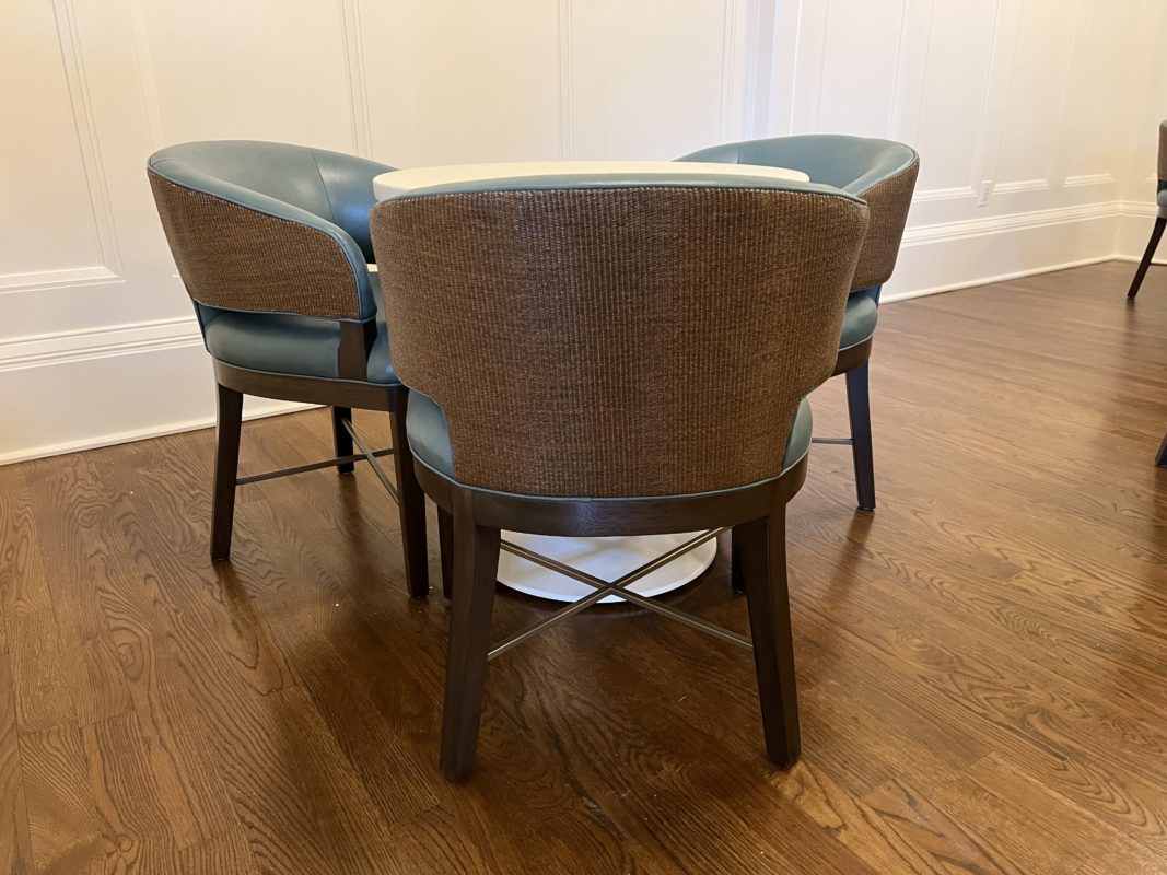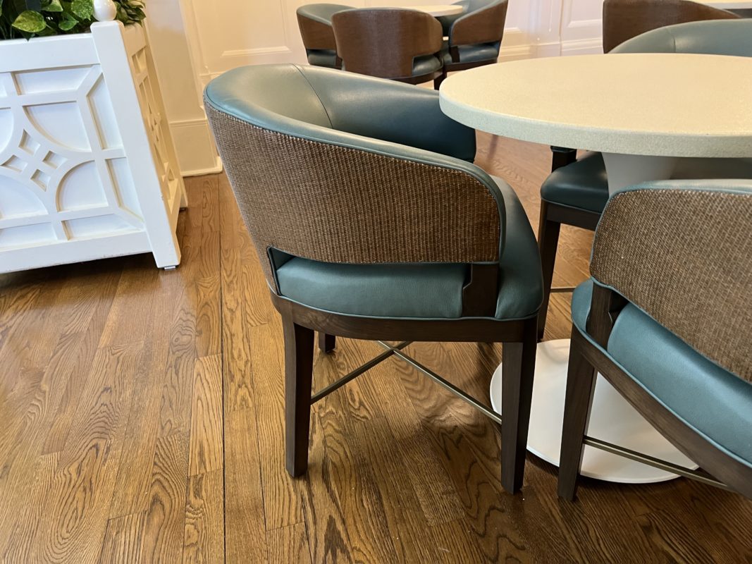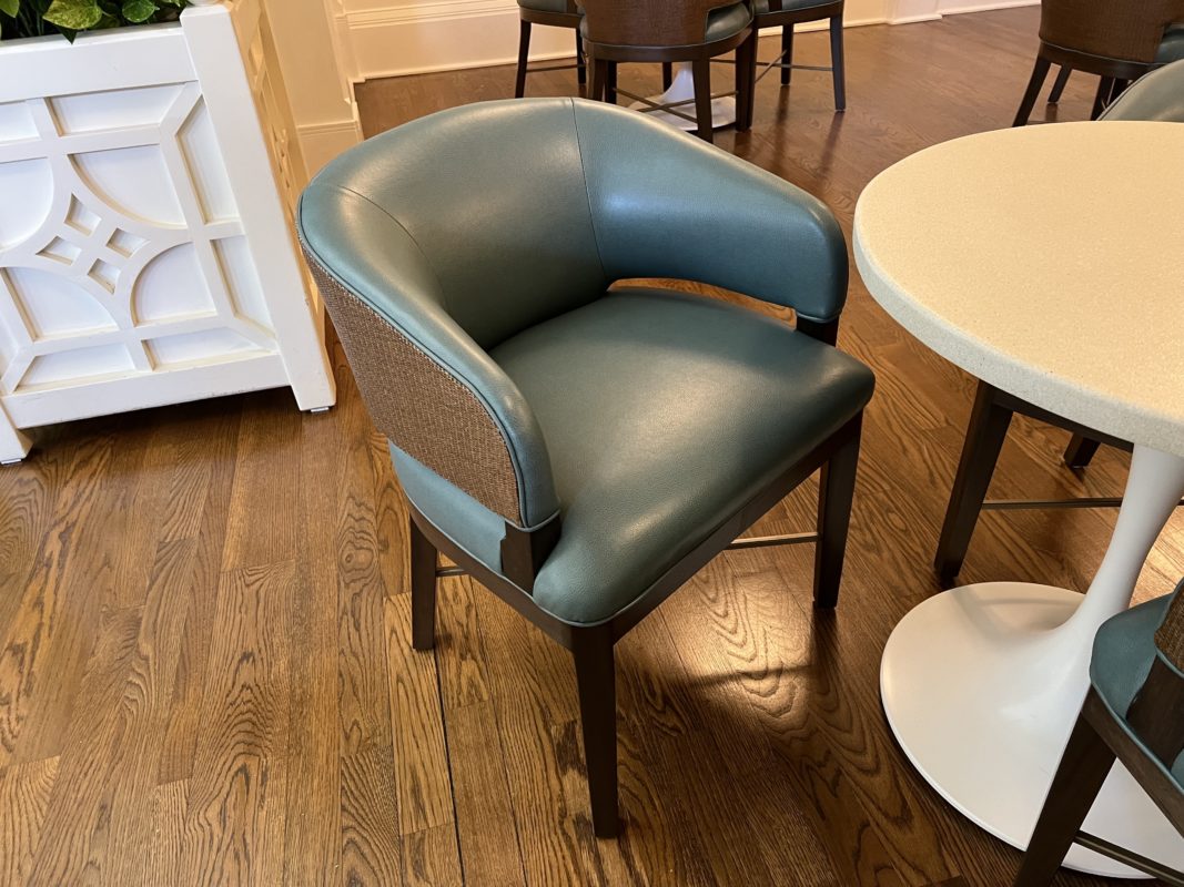 The comfy chairs are covered in dark teal vinyl and feature dark brown wooden legs and a matching woven backing.