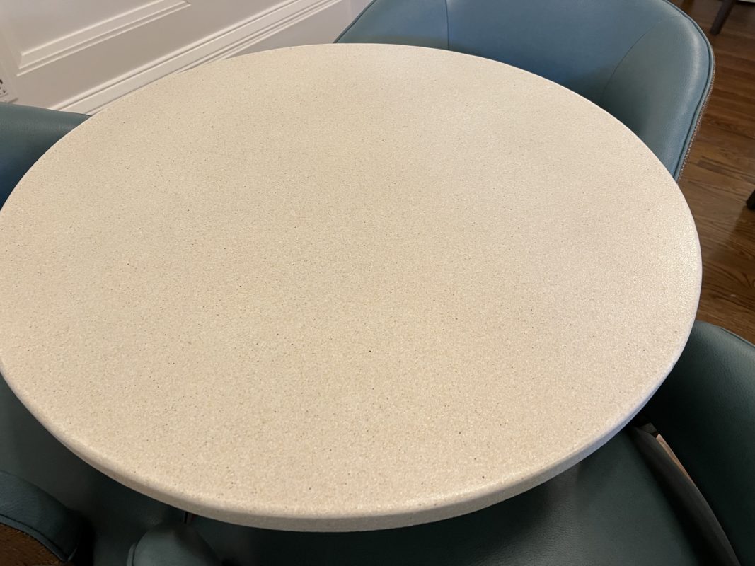 The table tops are made from an easy-to-clean material with a terrazzo-like design.
