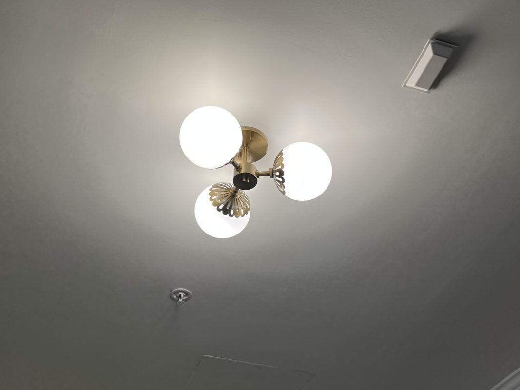 The lighting fixtures, which seem a bit small for the space, have a Victorian feel with brass lace decorative elements.