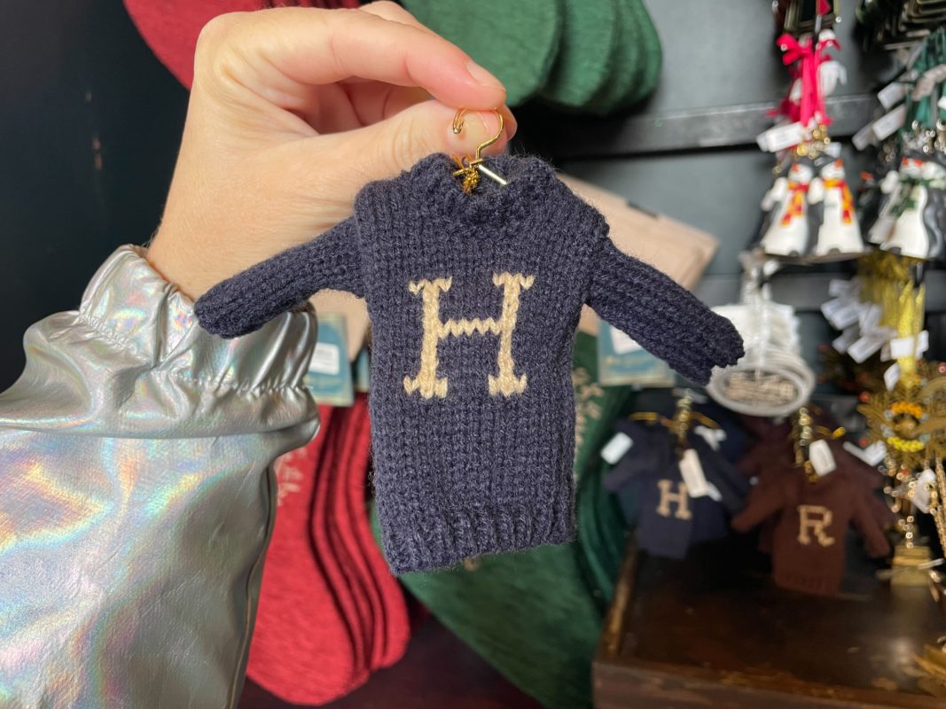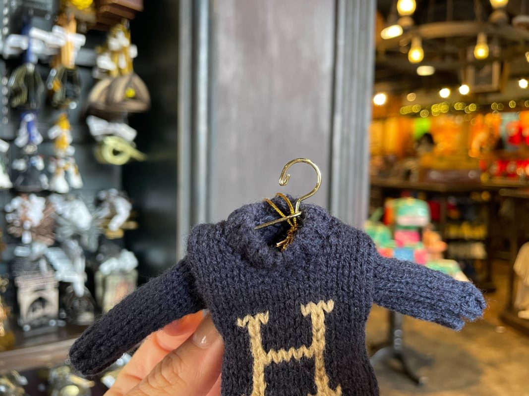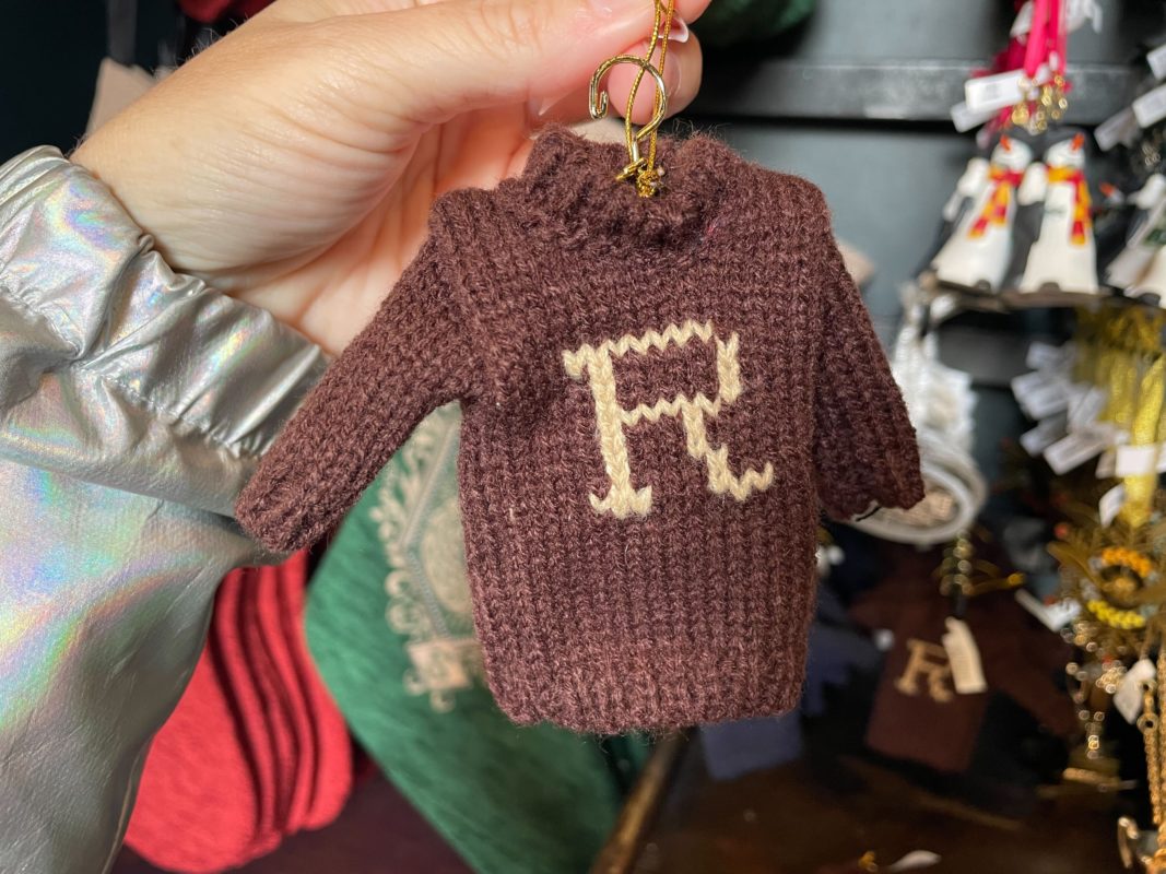 The ornament version of Ron’s sweater is, of course, maroon with a cream “R.” We found both ornaments in the Islands of Adventure Trading Company shop.