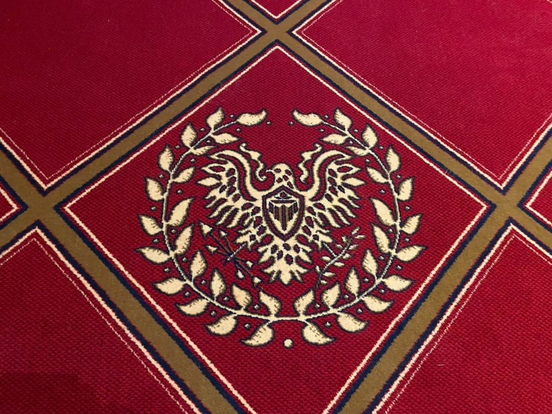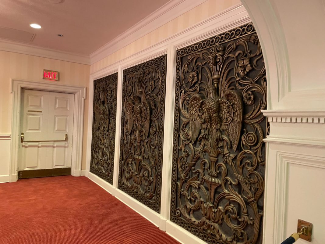 The stylized Great Seal icon also sits in some diamonds inside the theater.