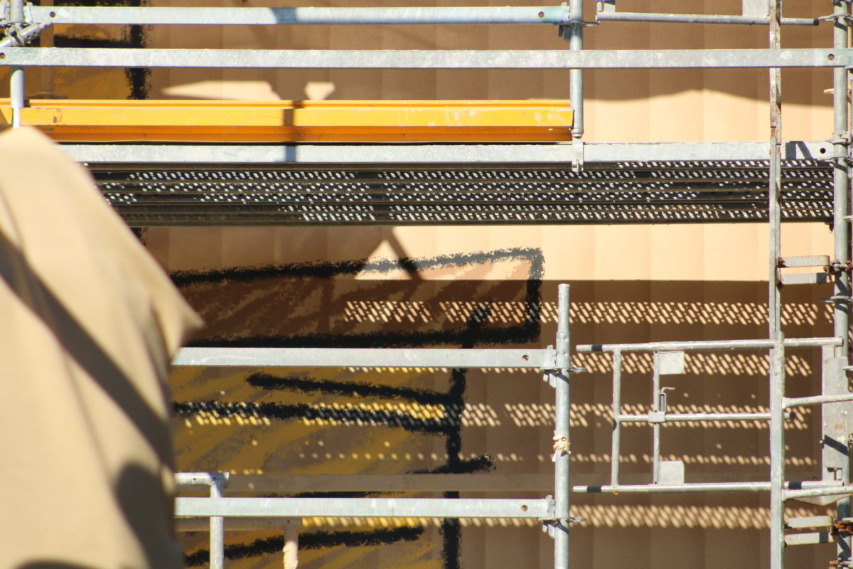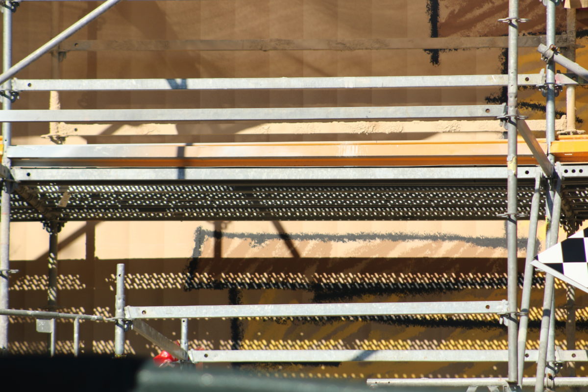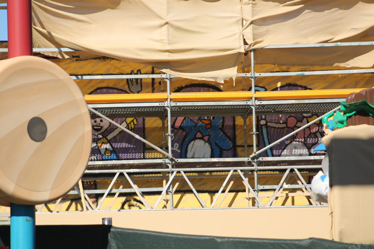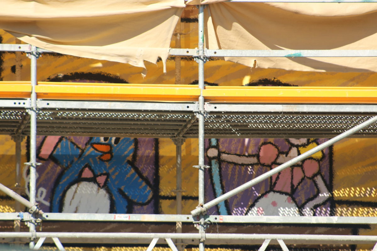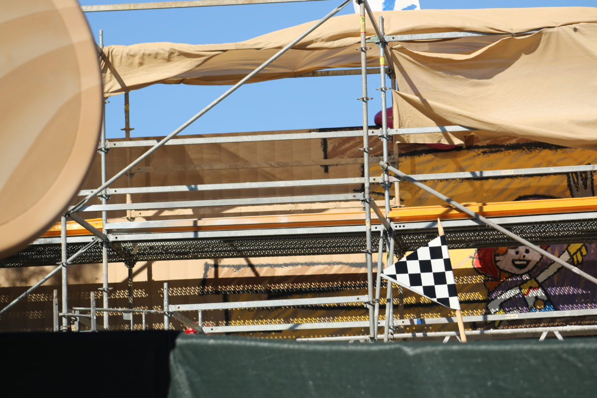 Scaffolding and another tarp still cover the façade, too. Checkered flags are near the entrance.