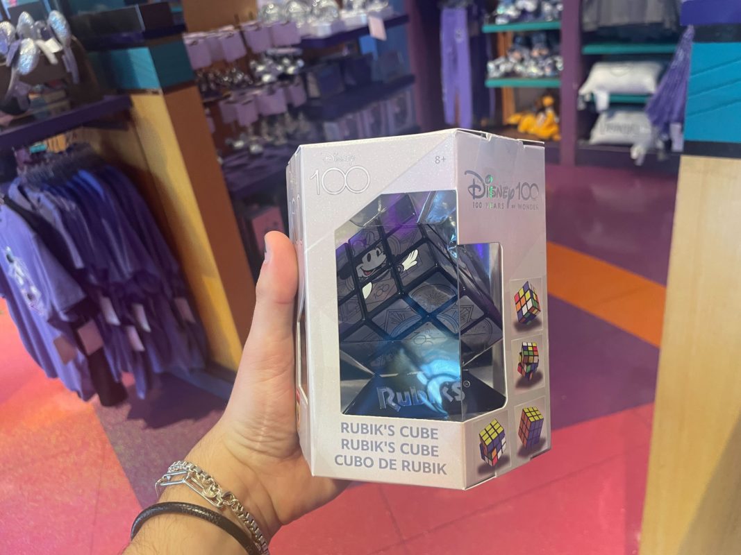 The silvery Rubik’s Cube features a different character in their 100th-anniversary costume on each side. One side just has the art deco Disney100 logo. It includes a display base.