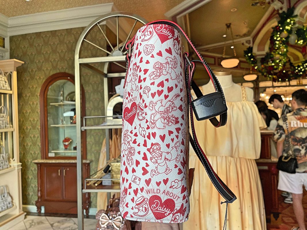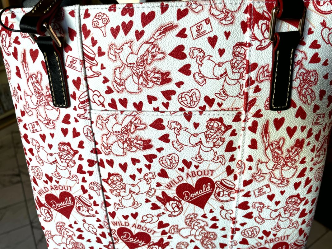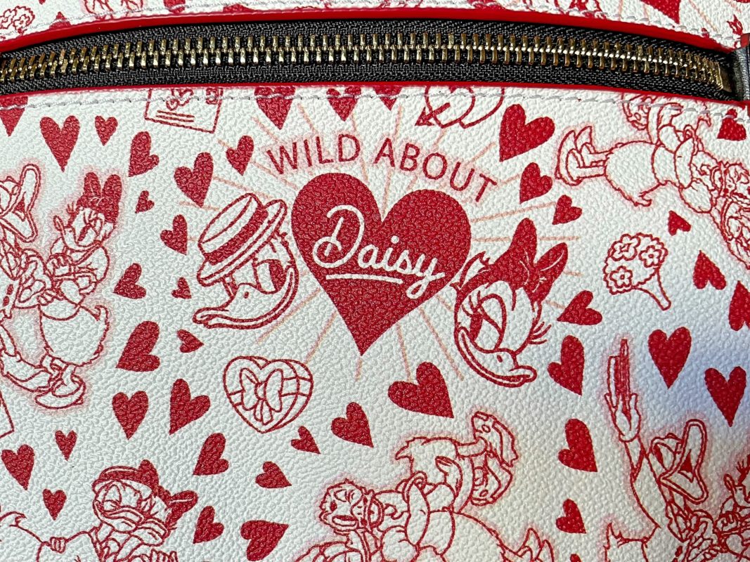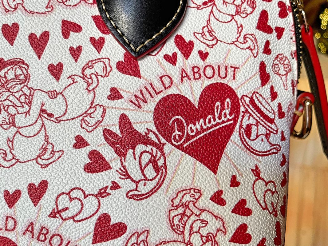 The allover print features art of Donald and Daisy Duck, outlined in red, and set against a white simulated leather background. They are dressed in 1920s attire, to reflect the era The Walt Disney Company was founded.
