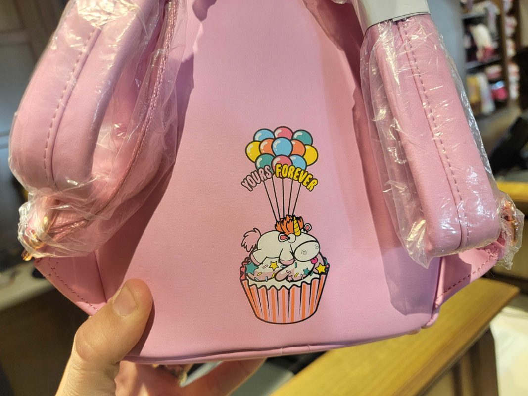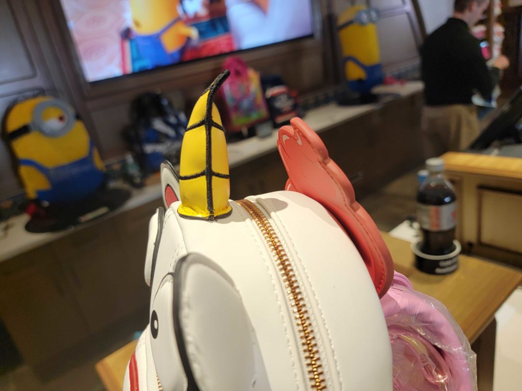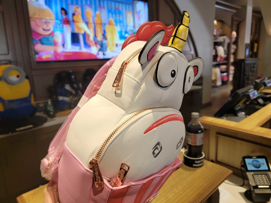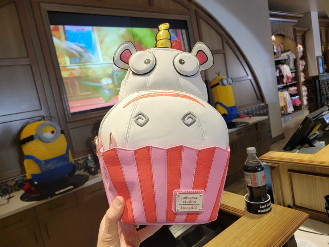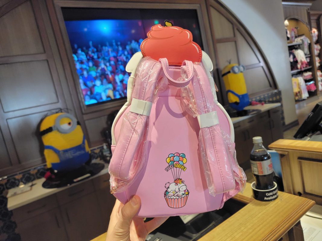 The backpack is inspired by the white unicorn plush that Agnes declares is “so fluffy, I’m gonna die!” in the first “Despicable Me” movie. It sits in a pink-striped cupcake liner. The plaque on the front has logos for Universal Studios and Loungefly.