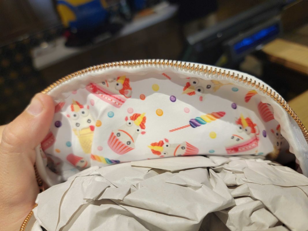 The interior lining is white with an all-over pattern of unicorn snacks like cupcakes, ice cream, and cake.