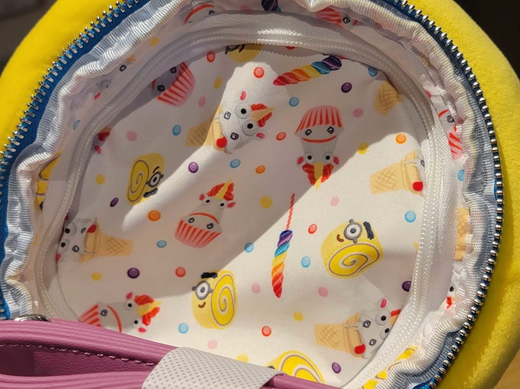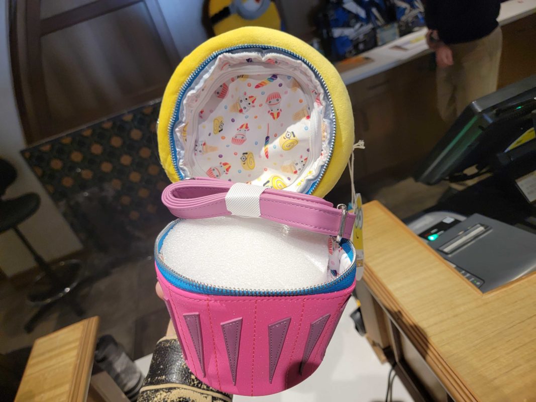 This purse is shaped like a Minion cupcake, with a dark pink liner and blue fabric around the zipper.