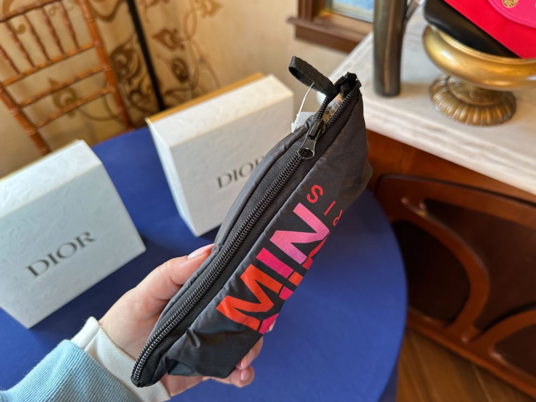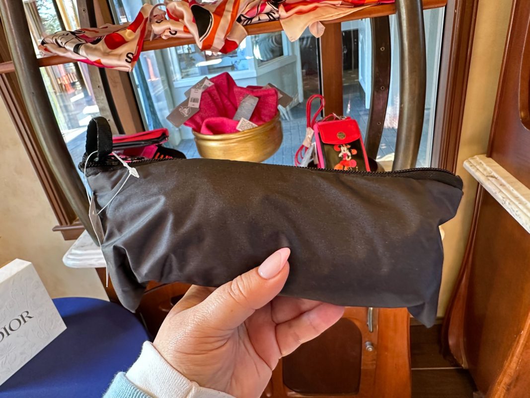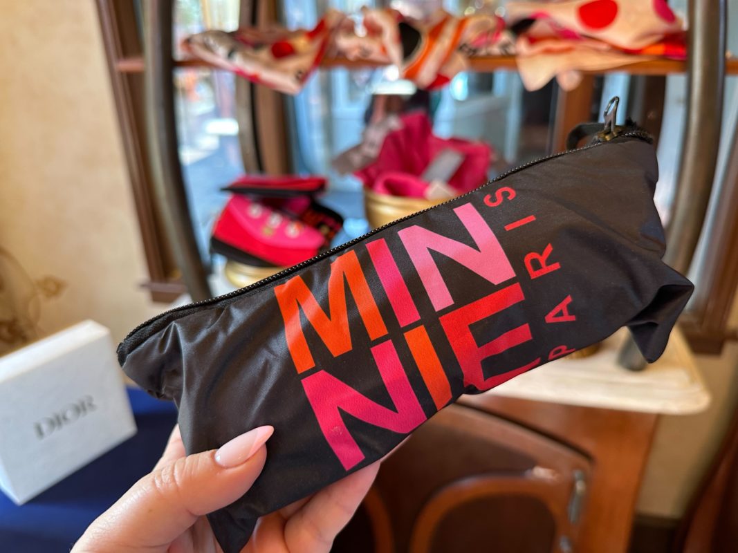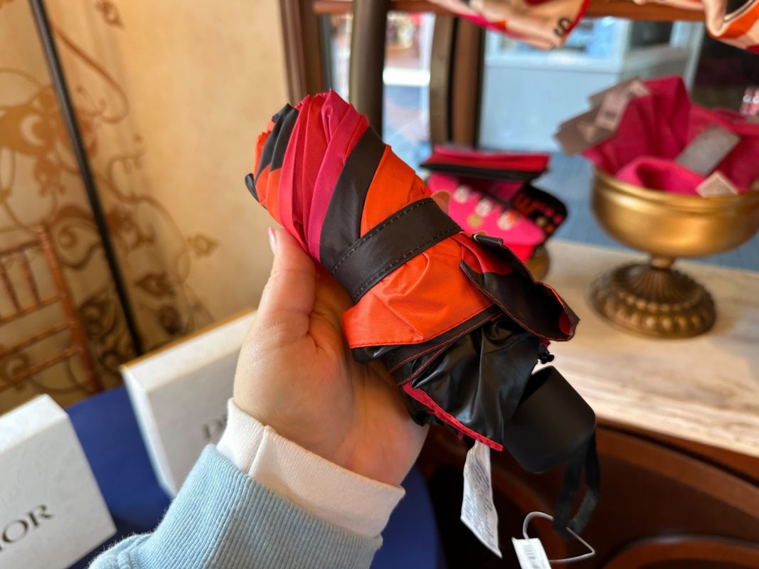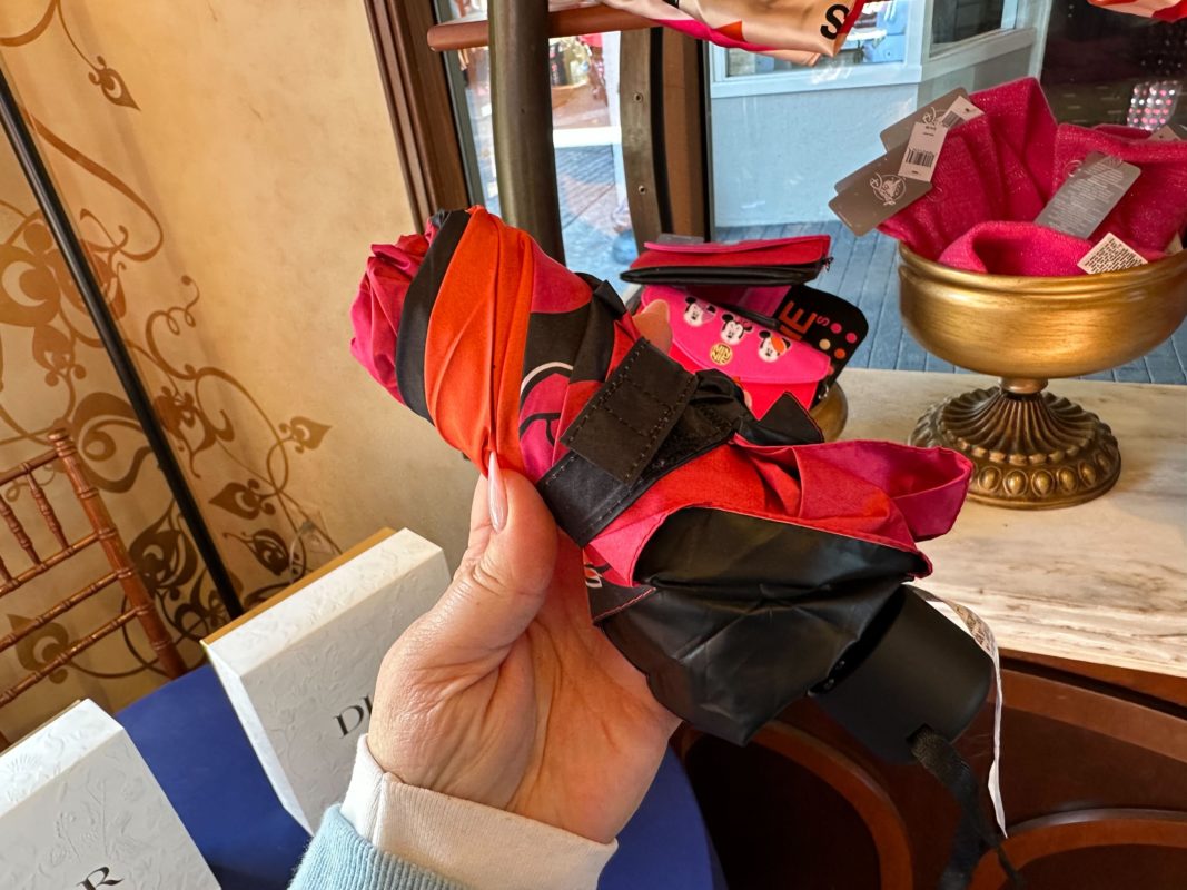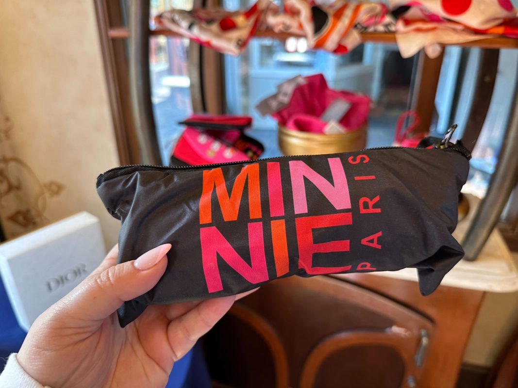 The umbrella comes in a pouch reading “Minnie Paris” in pink, red, and orange lettering.