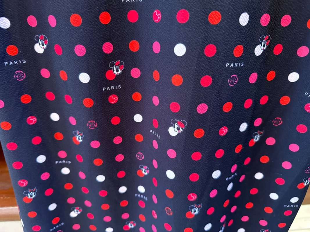 Minnie is pictured on a larger pink polka-dot on the left breast. Smaller Minnie faces are among the dots.