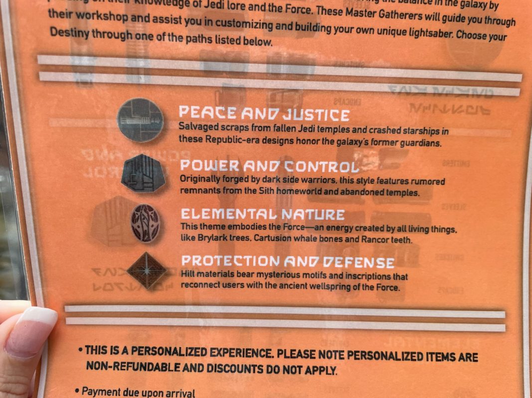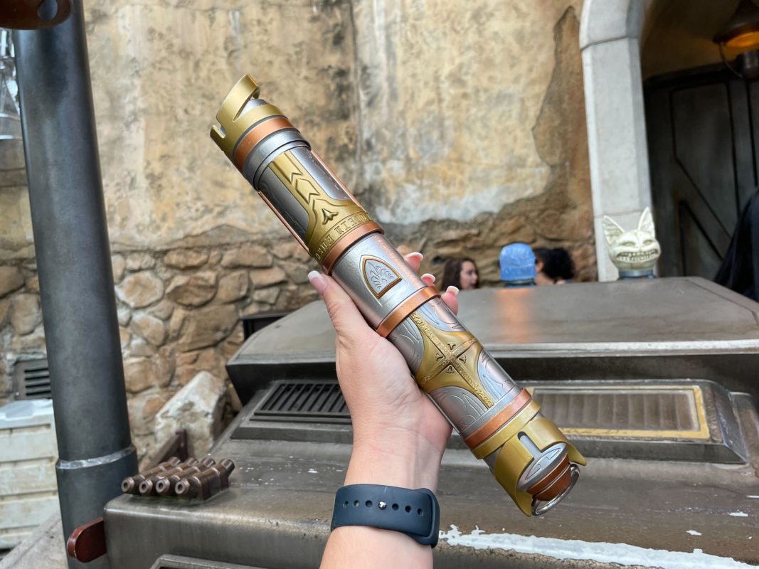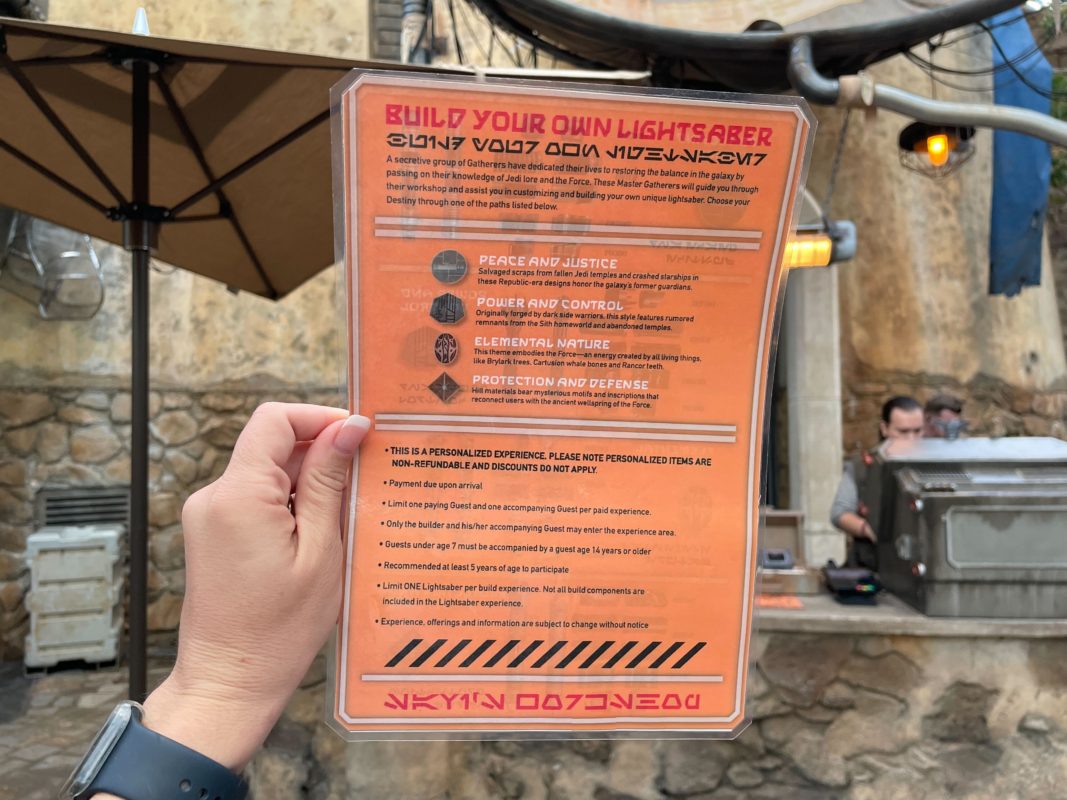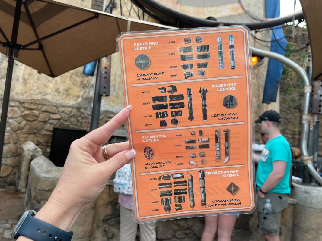 Savi’s Handbuilt Lightsabers is the custom Lightsaber building experience in Star Wars: Galaxy’s Edge at Disneyland Park and Disney’s Hollywood Studios. Guests must pre-pay $249.99 plus tax for the experience, which includes a lightsaber (a hilt, two sleeves, one emitter, one pommel cap, one set of activation plates and switches, and a 31″ blade), a cloisonné pin, and a lightsaber carrying case.