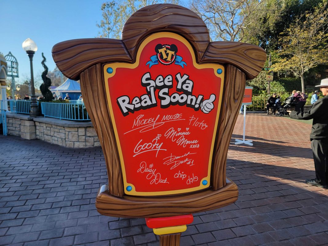 The opposite side of the sign reads “See ya real soon!” It’s covered in the autographs of Mickey and his friends.