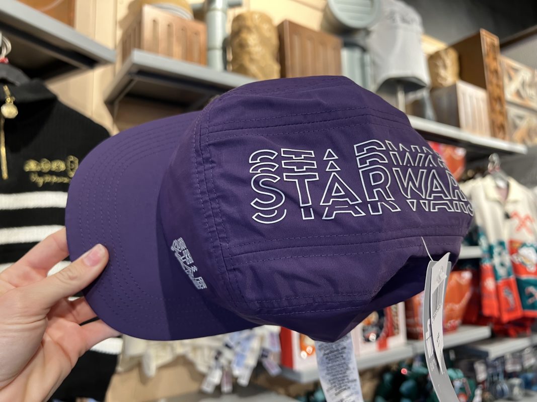 A fancy purple Star Wars logo hat is at Tatooine Traders. The hat is brightly colored and has Star Wars printed near the brim and on top of the hat for $29.99.