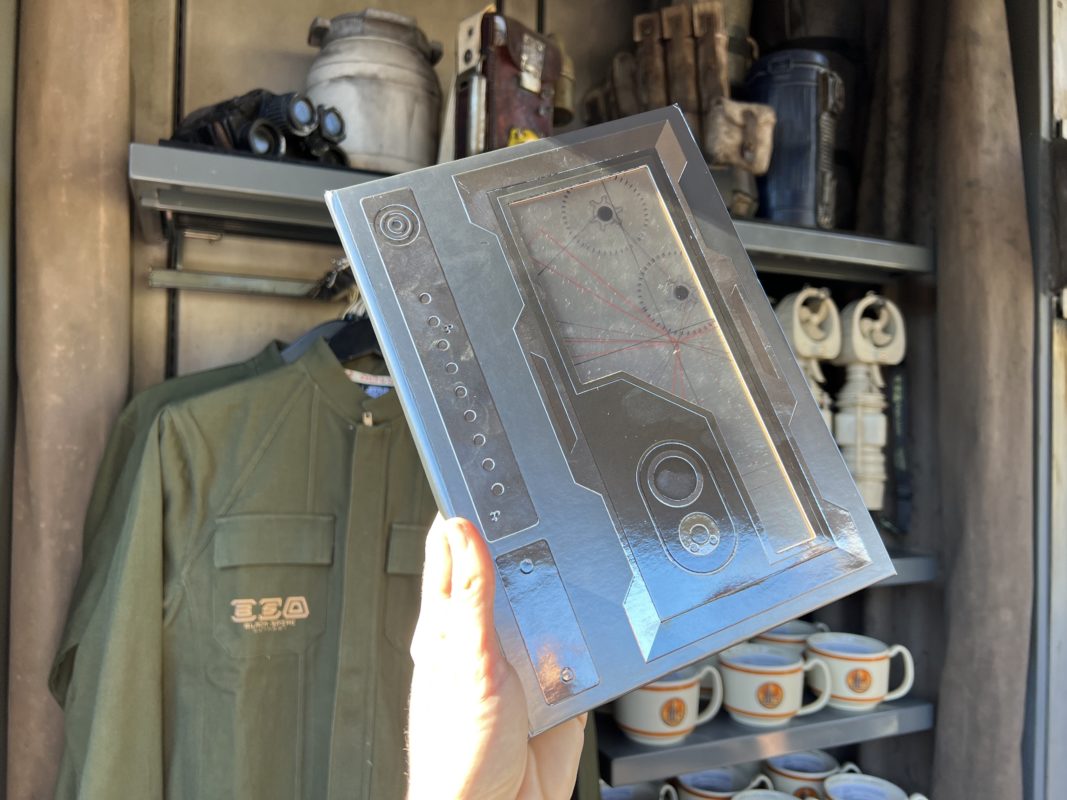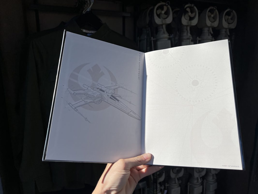 A very reflective notebook is now at Resistance Carts near Star Wars: Rise of the Resistance. The hardcover of the notebook has a metallic silver casing, and the inside has the Rebel Starbird and X-wing ships for $24.99.