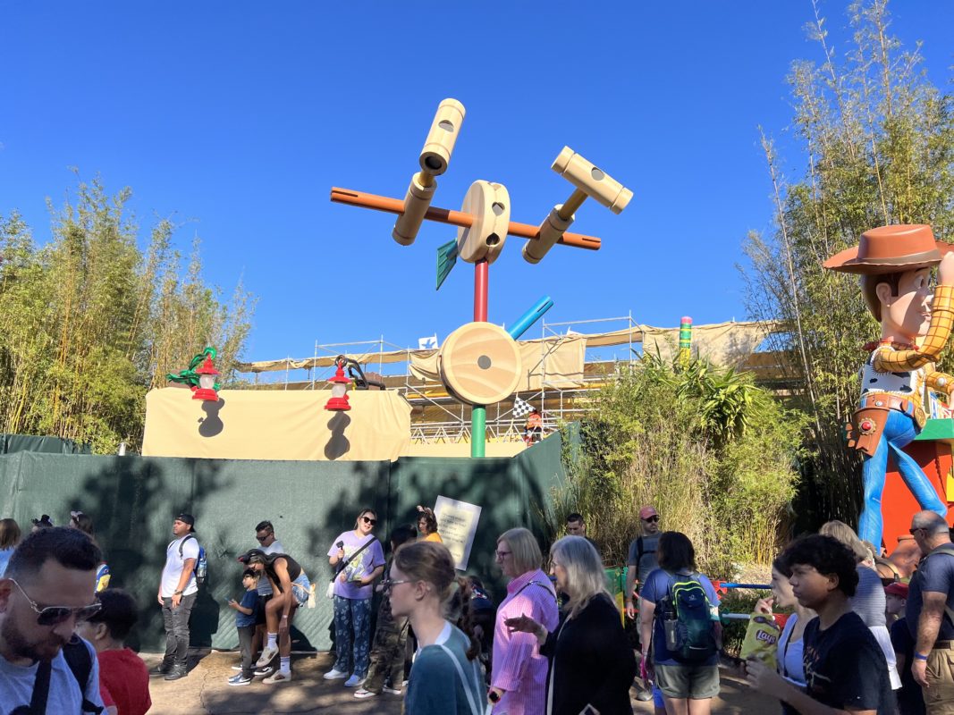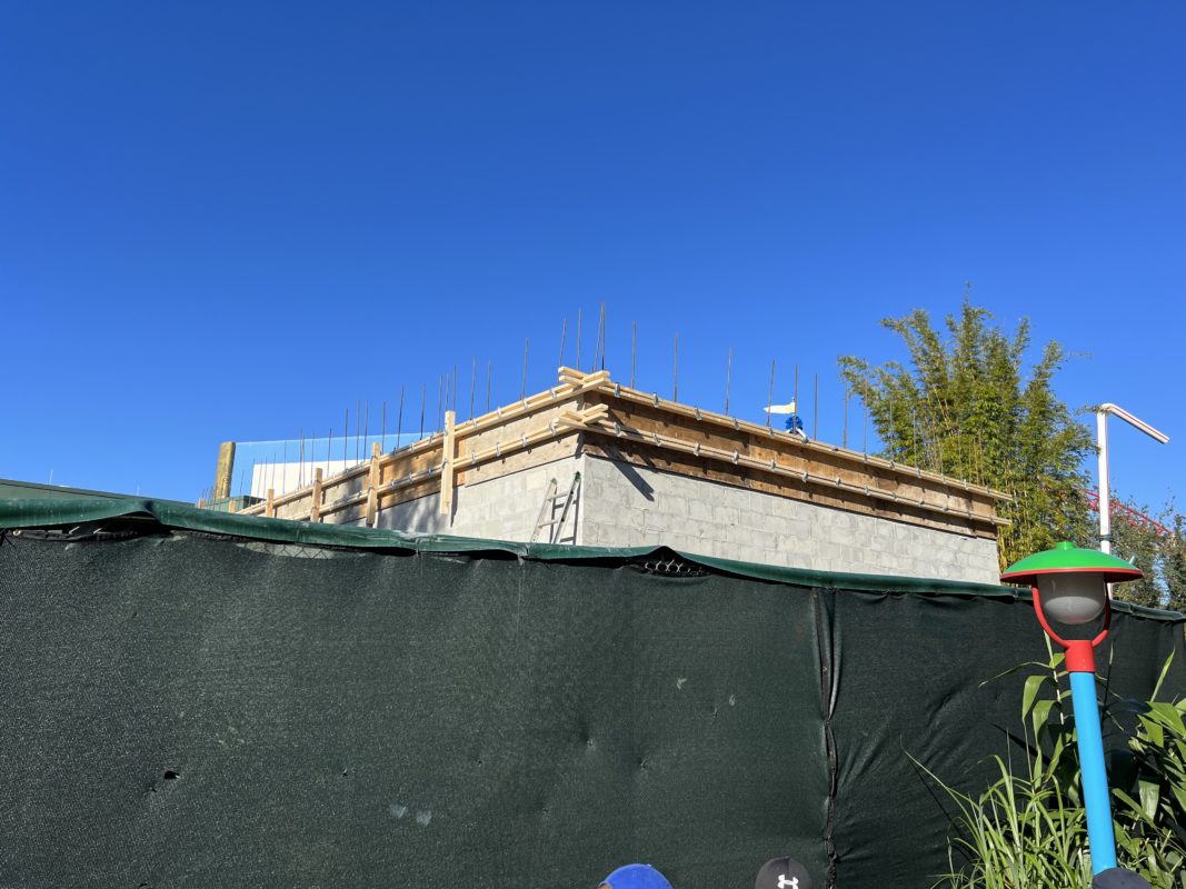 There is more construction occurring at the top of the building that is near the exit of Toy Story: Midway Mania and behind Woody’s Lunchbox. It appears as though they are working on the roofing for the future building.