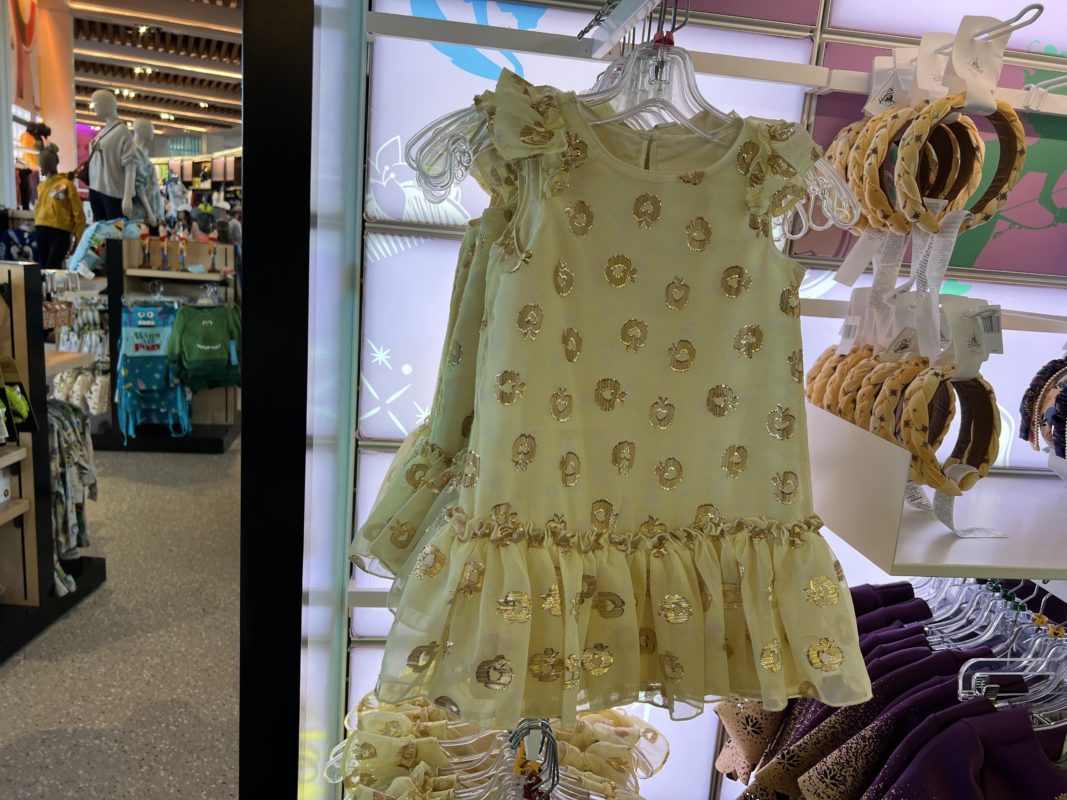 Back in Creations, we found a whimsical yellow youth dress that is inspired by Snow White. Gold apples glitter on the flowy fabric. The dress is in the youth section for $49.99.