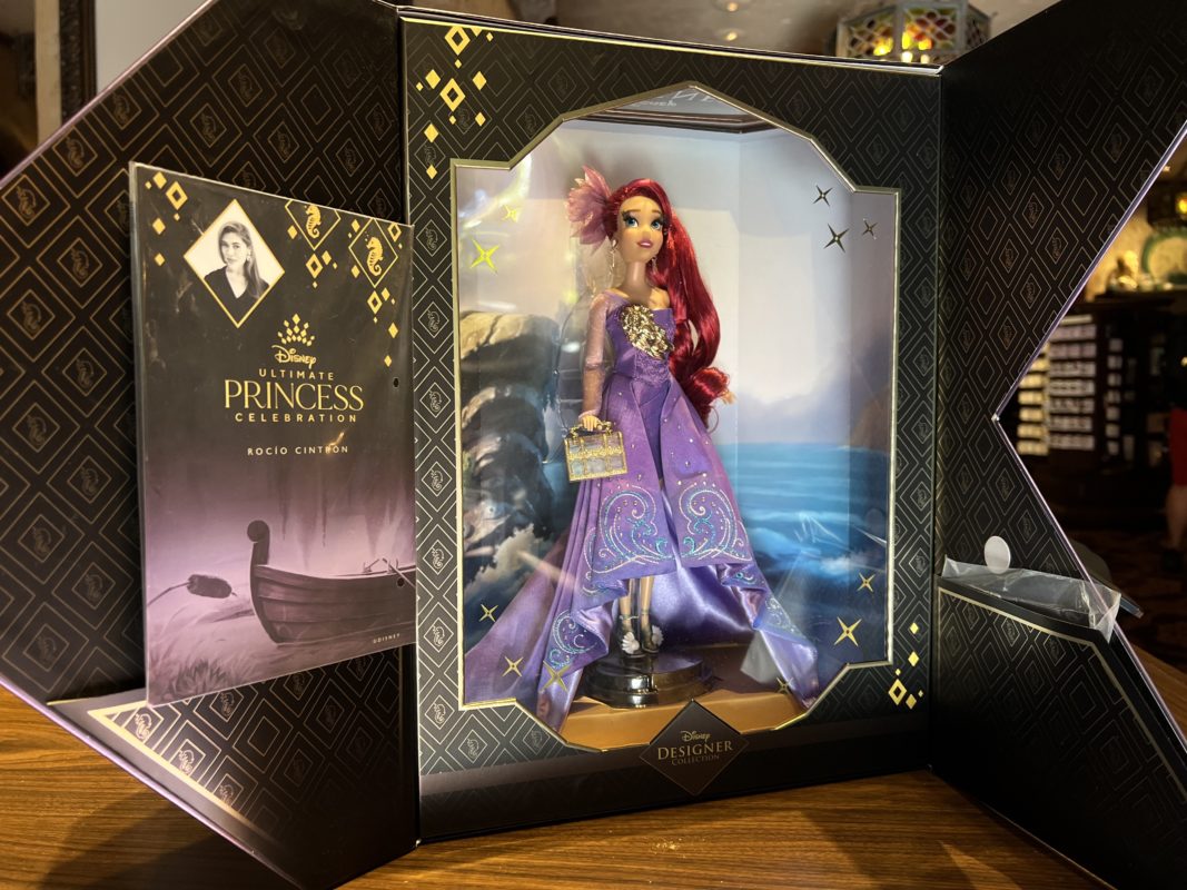 Tower Hotel Gifts has a new Disney Princess Designer Doll, Ariel. She has a long flowing purple dress and gold handbag for $129.99.