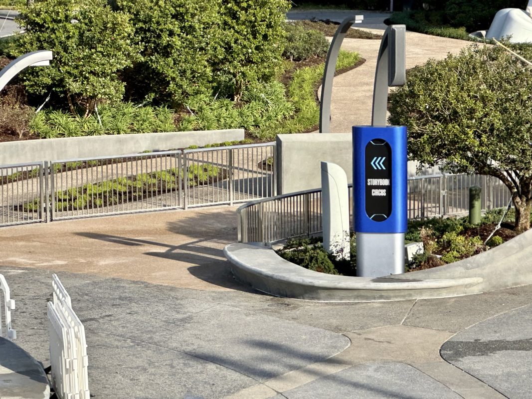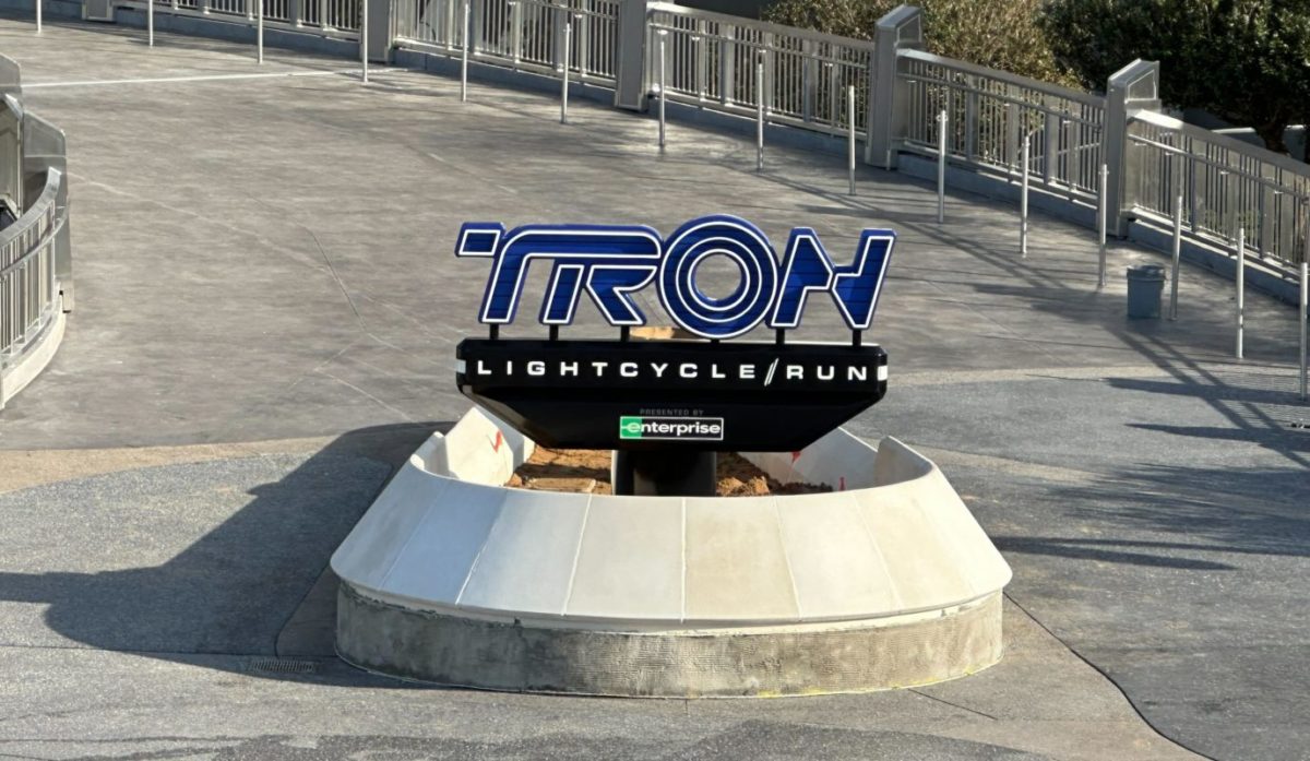 Next, we hopped on the PeopleMover to take a look at the construction at TRON Lightcycle / Run. A new entrance sign has been installed in the planter at the entrance of the walkway. The attraction TRON Lightcycle / Run is presented by Enterprise.