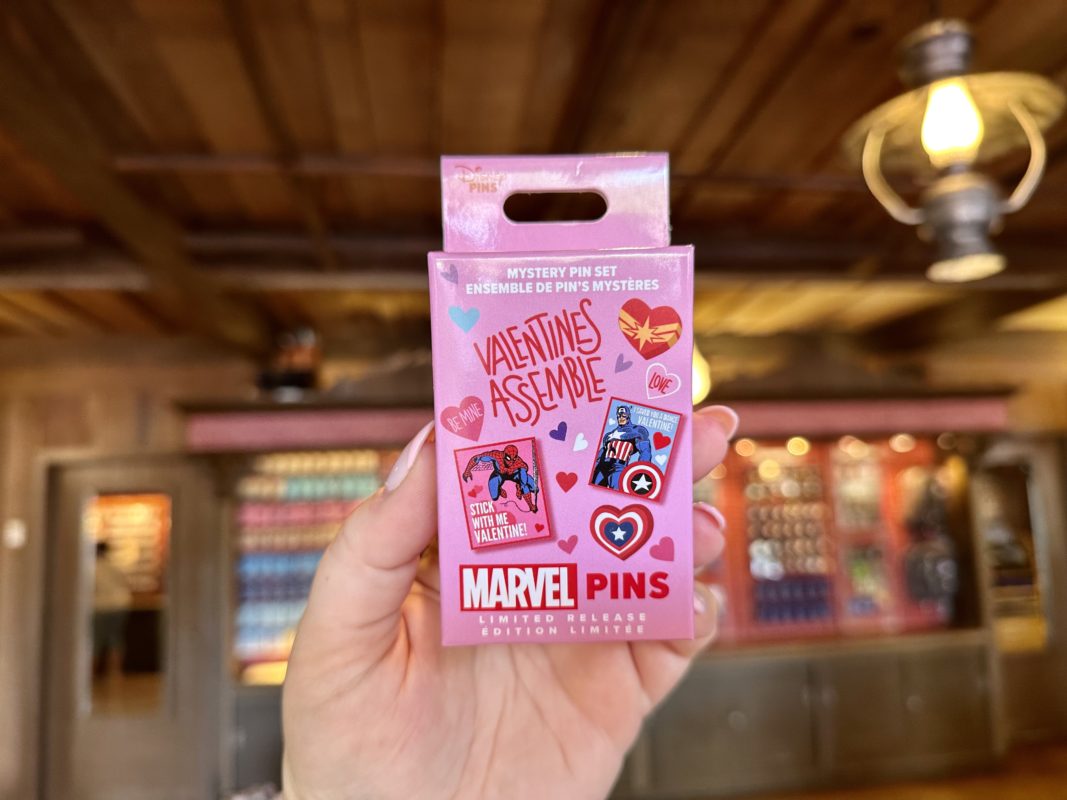 New pins have been released in Walt Disney World today. We found two new mystery pin sets in Frontier Trading Post. The first is a Valentine’s Assemble Marvel limited release mystery pin set. This set includes two randomly selected pins out of 11 designs.