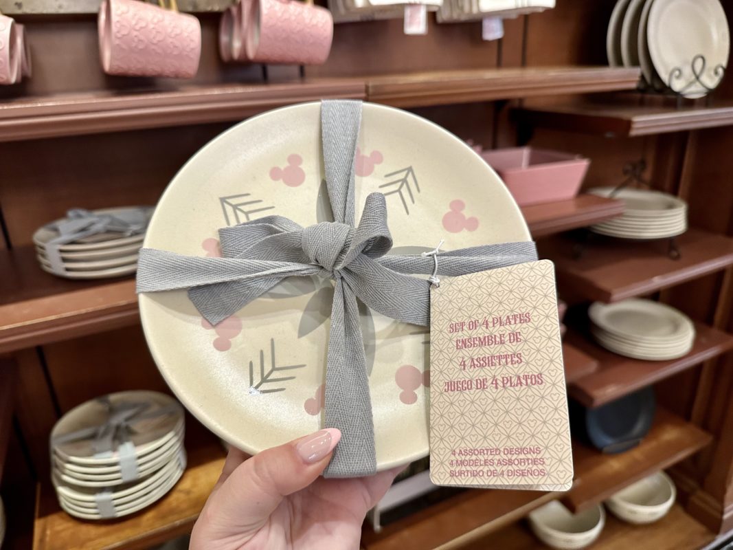 A new Mickey Mouse salad plate set is now available. This set is part of the Disney Homestead Collection and features four ceramic plates with a Mickey icon and arrow pattern.