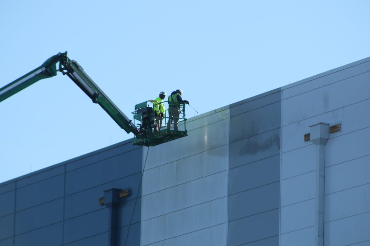 It is “Loam” that is coating the show building & Tron canopy. It is common on construction sites throughout Florida. It is not simple dirt, but Loam is a combination of clay, sand & hummus (decomposing plant material). In Florida it is always stirred up & goes airborne in open construction sites and STICKS to neighboring structures and homes. Because of the unique combination it encourages mold & algae growth which gets darker as it accumates & grows. That is why it looks so dark & filthy so quickly. Until all the open exposed ground is covered by grass, plantings or walkways the loan will continue to blow around and stick to nearby structures. This may not be the last time they will need to clean the show building & canopy as every open exposed ground surface is still not covered. Even a light dusting of Loam after this current “power wash” will still encourage mold & algae growth very soon. Unfortunately it will be most visible on the “white canopy” when it develops again.