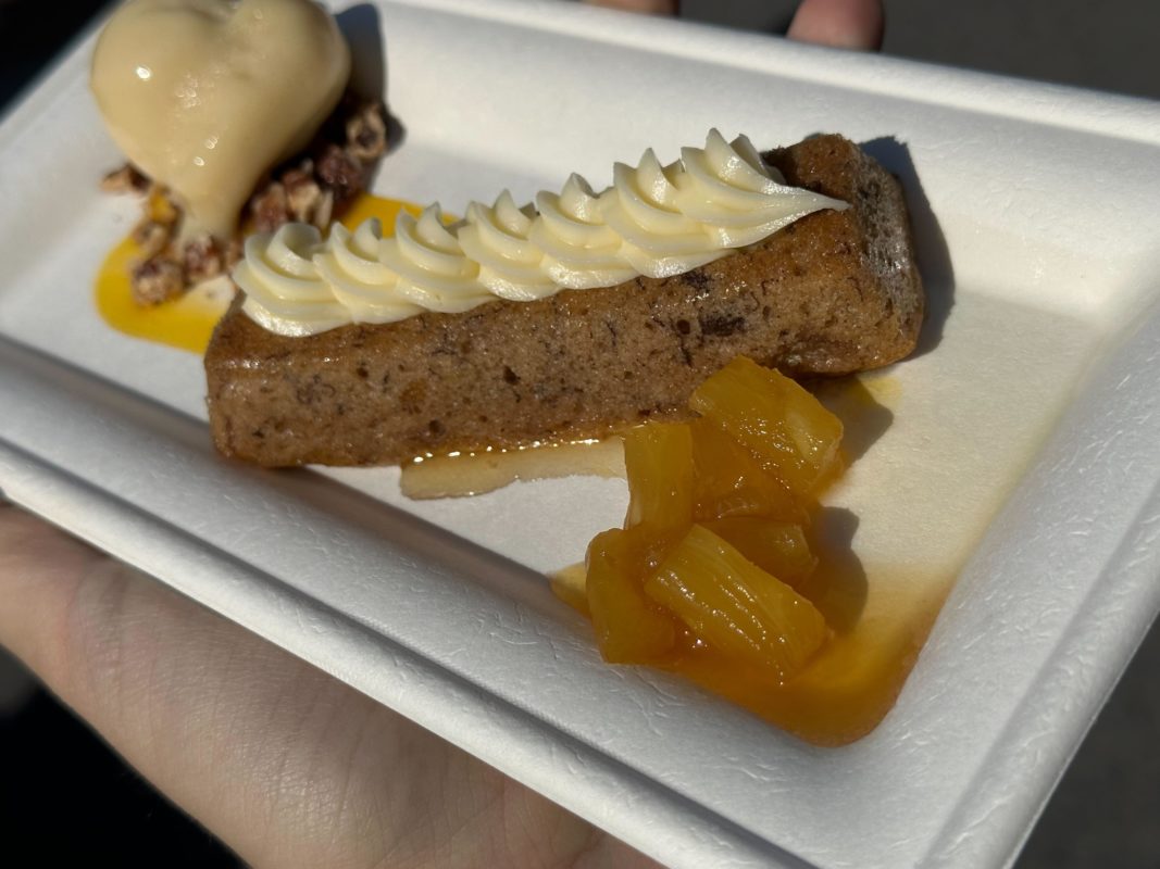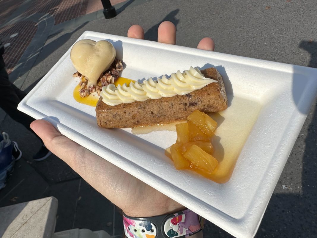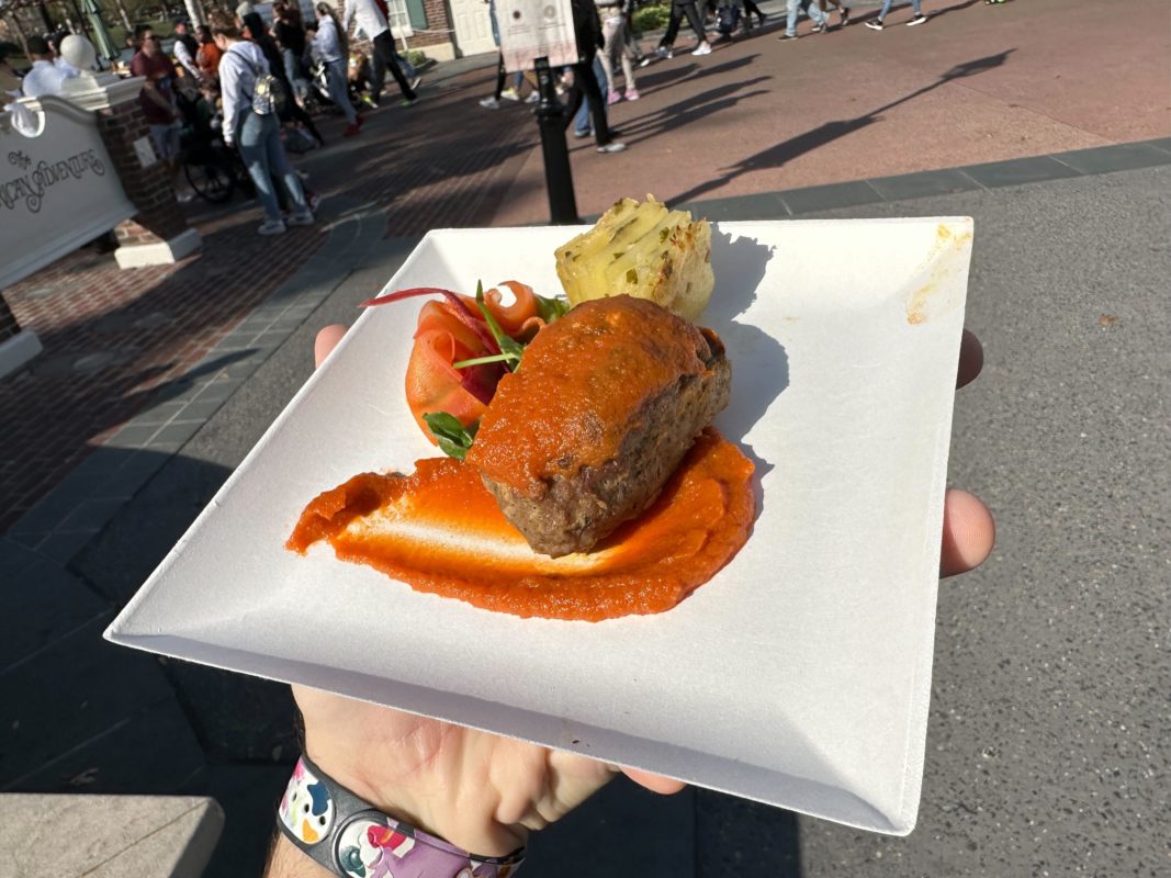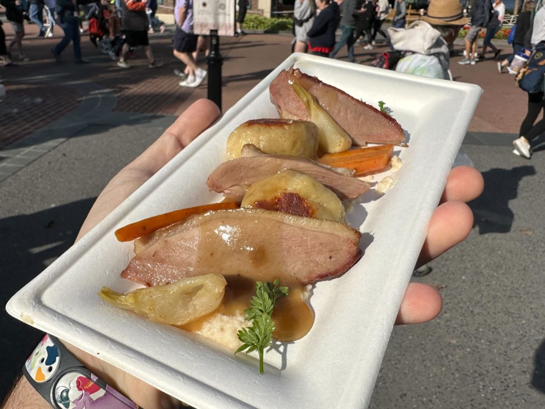 The Artist’s Table, located in the American Adventure, is known for bringing typical, daily comfort food and elevating the dishes to have an elegant flair, and this year at the 2023 EPCOT International Festival of the Arts is no different. On the menu this year, there are three new dishes including a fancy, three-meat meatloaf, duck and dumplings, and a banana cake with lots of fruit.