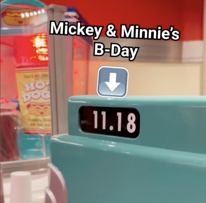 At the concession stand, the registers display totals of 11.18 and 19.28, representing Mickey and Minnie’s birthday of November 18, 1928.