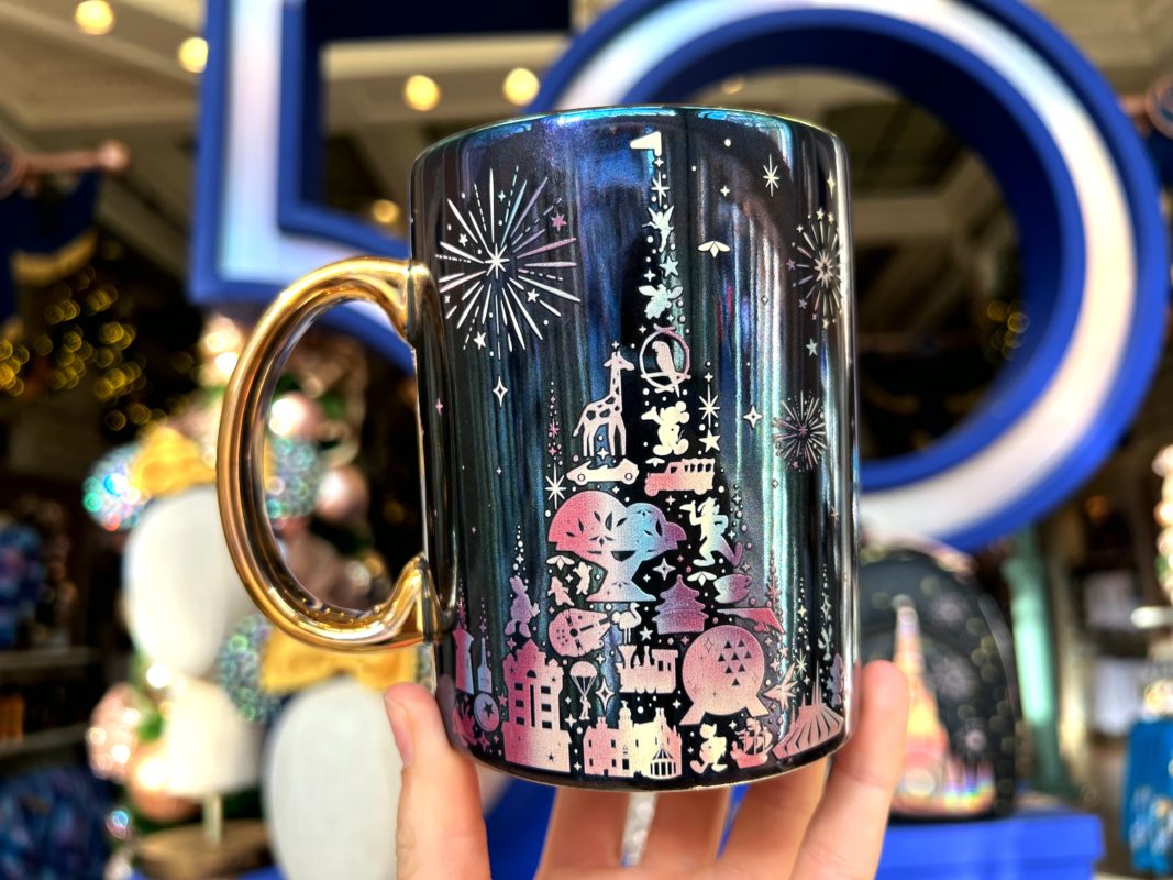 This Walt Disney World 50th anniversary grand finale ceramic mug has an iridescent finish with the Walt Disney World 50th Anniversary logo on the front and a gold-toned handle.