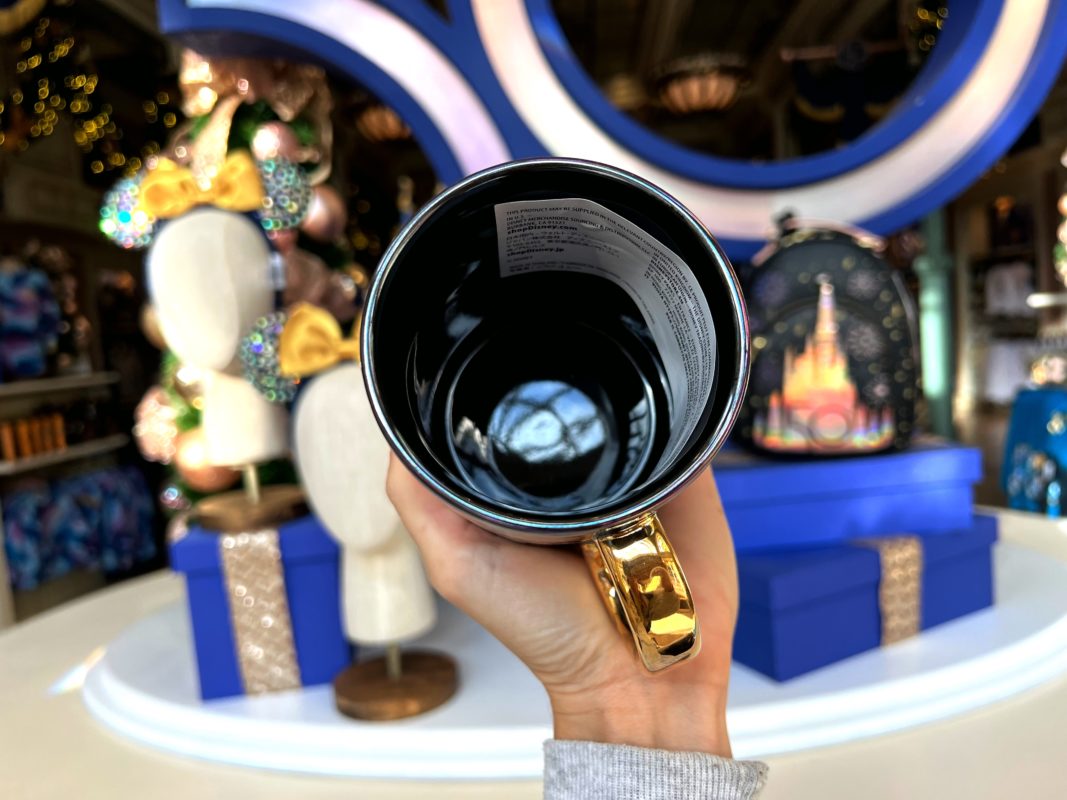 The back of the mug features silhouettes – in ombré shades of cream to purple, of various characters and park attractions in the shape of Cinderella Castle in an iridescent metallic finish.