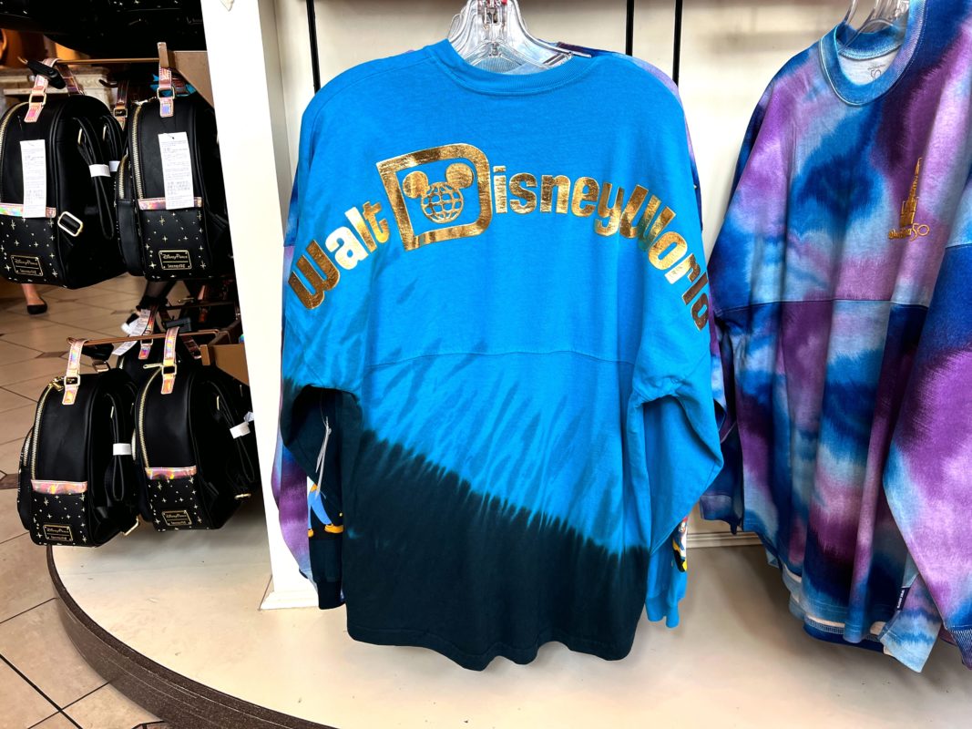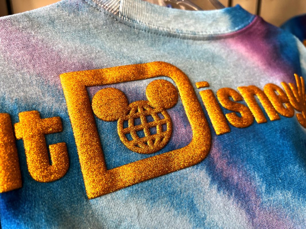 This spirit jersey has drop shoulders and features a golden foil Walt Disney World logo across the back shoulders. The tie-dye effect continues on the back.
