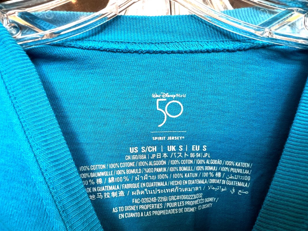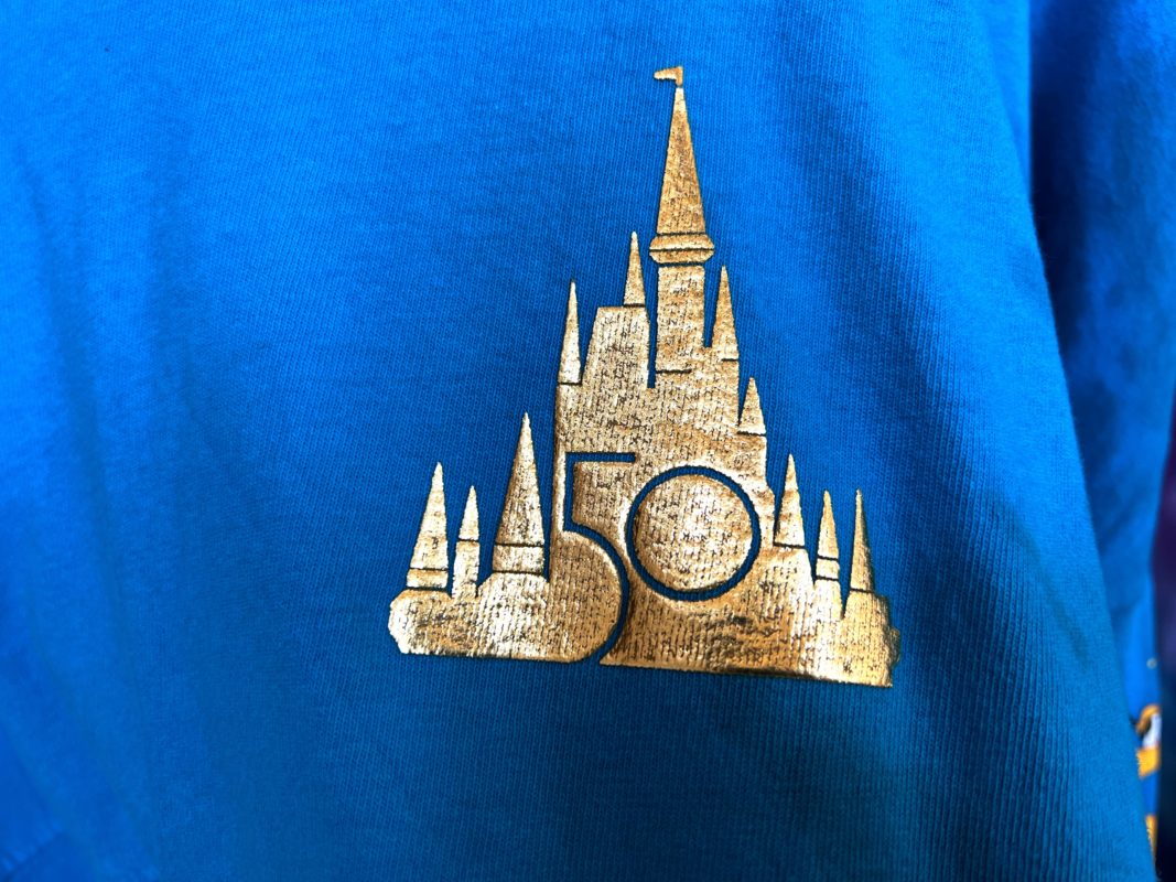 On the upper left chest is a glimmering gold-toned image of Cinderella Castle with “50” on the front of the castle in puffy ink.