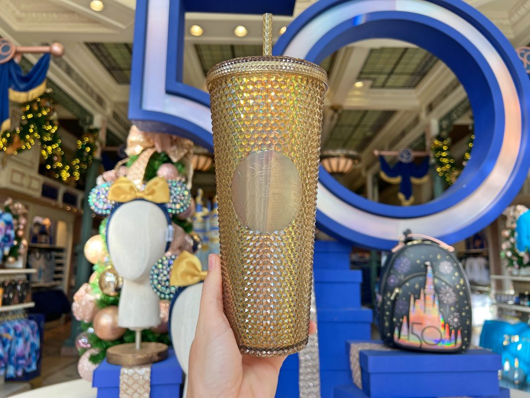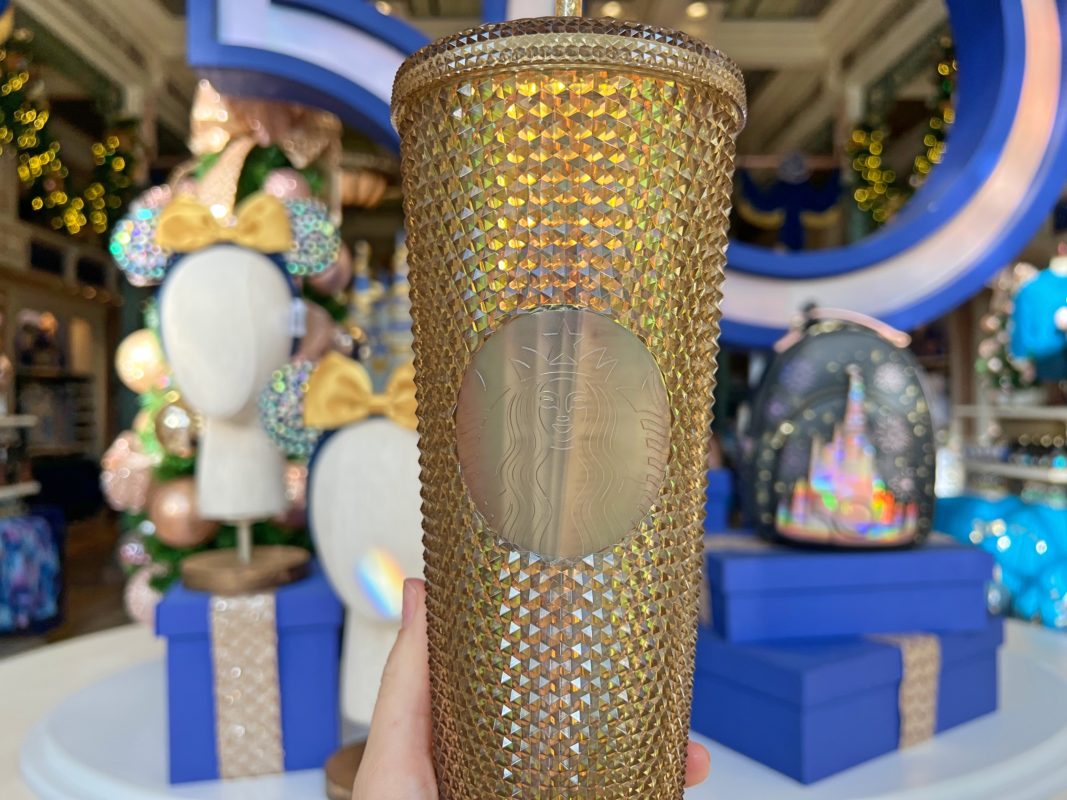 The Walt Disney World 50th anniversary grand finale geometric Starbucks tumbler is in a solid gold tone with an allover raised geometric design, a jewel-adorned lid, and straw.