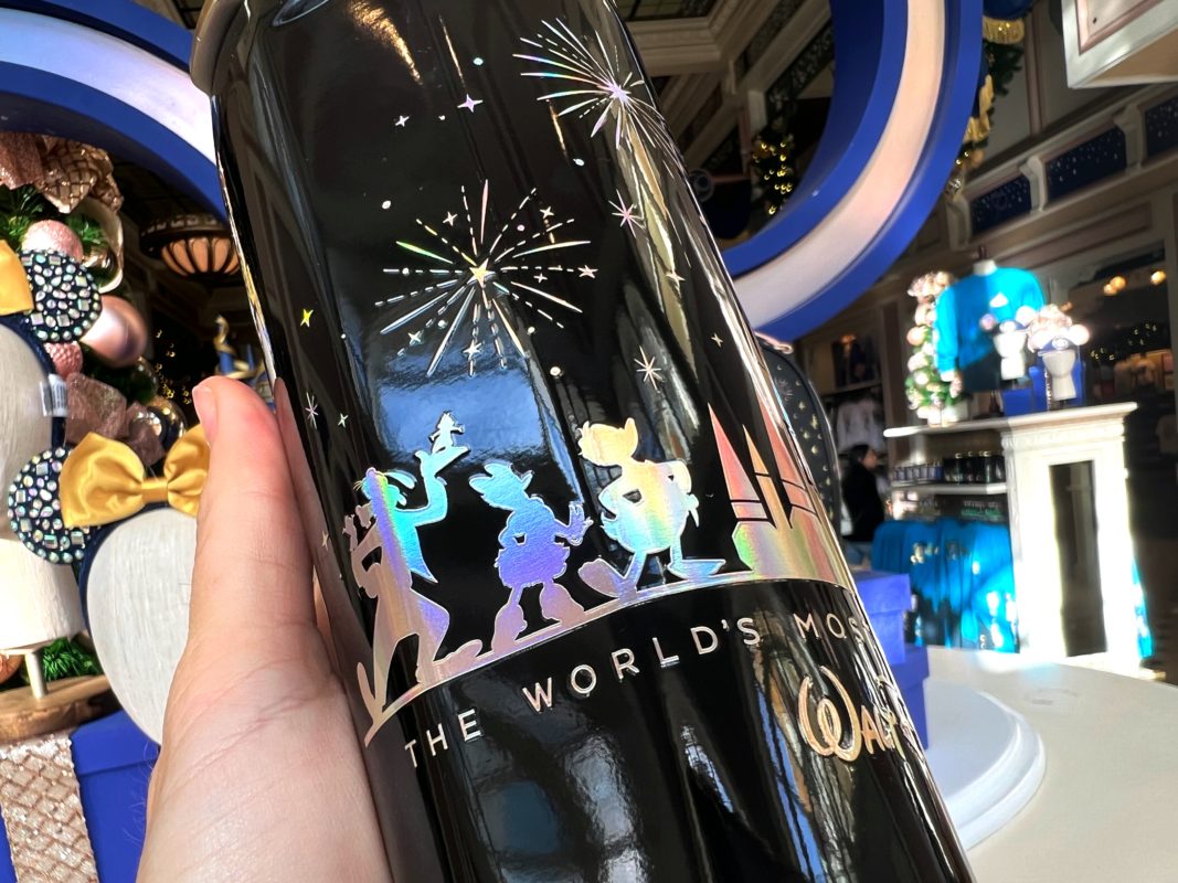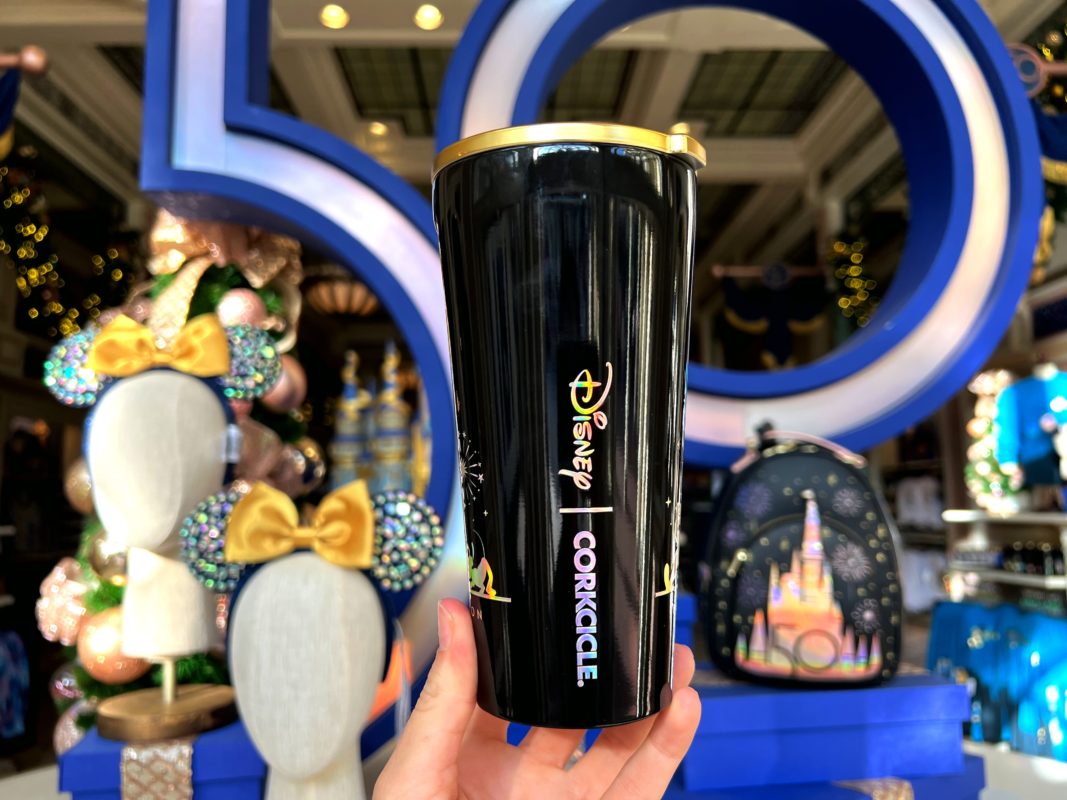 This stainless steel travel tumbler by Corkcicle, celebrating the 50th anniversary of Walt Disney World, has a black finish with an iridescent Walt Disney World 50th Anniversary logo and character silhouettes on the front. It is the perfect grand finale to mark the occasion.