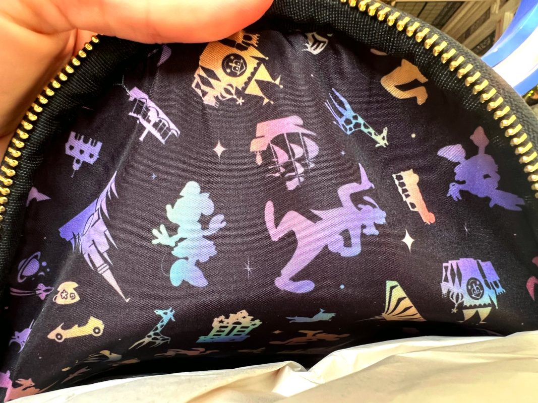The spacious main compartment is fully lined with various colorful patterns from around the Walt Disney World Resort including attractions and characters and twinkling stars.