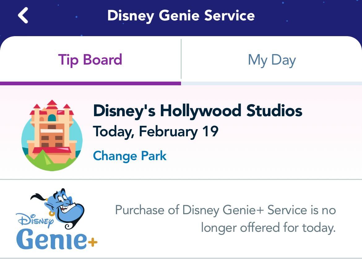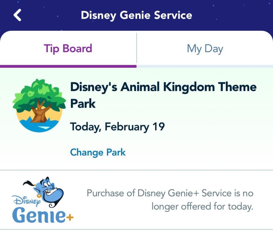 All four Florida parks show that “purchase of Disney Genie+ Service is no longer offered for today.”