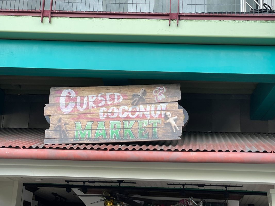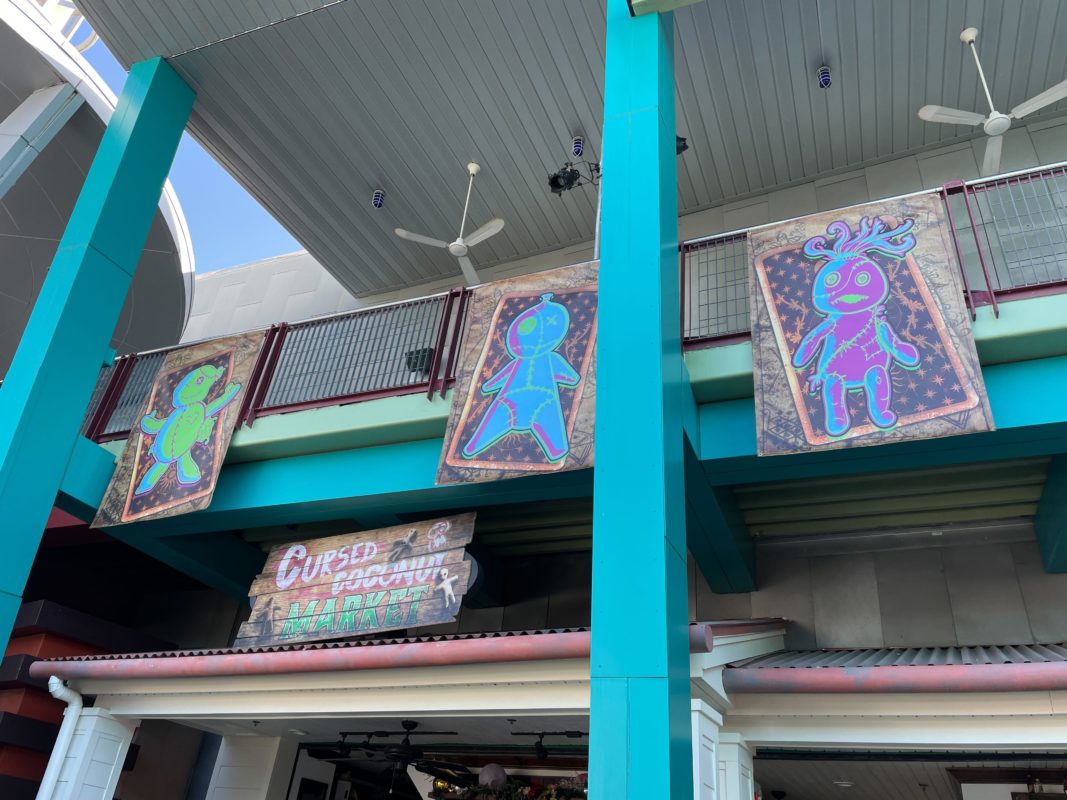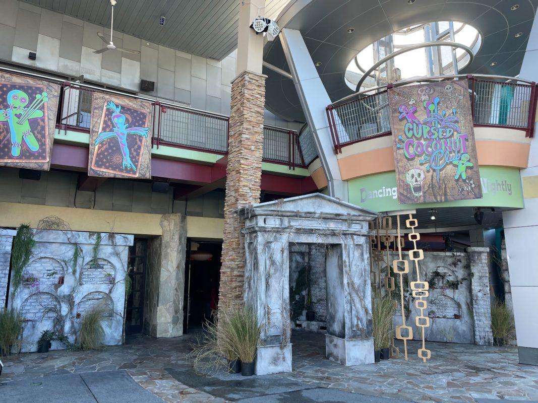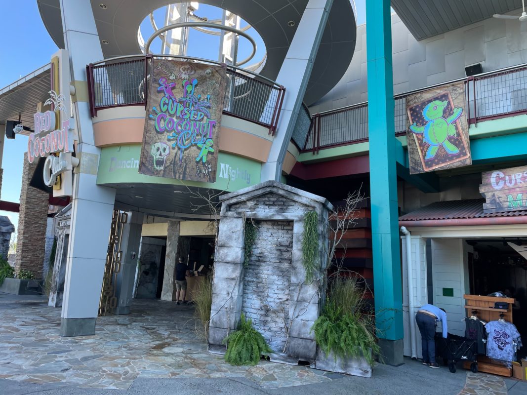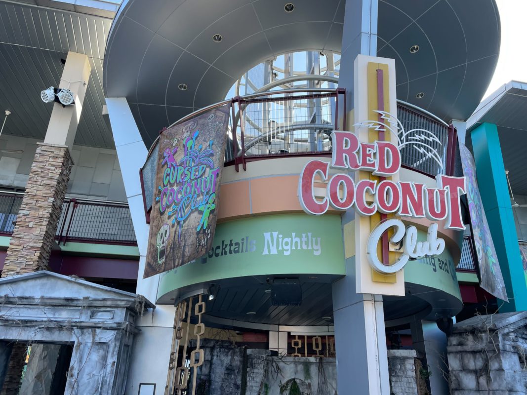 The banners hanging above the Red Coconut Club entrance read “Cursed Coconut Club.” They also feature neon Voodoo dolls as well as skulls and skeletal animals.