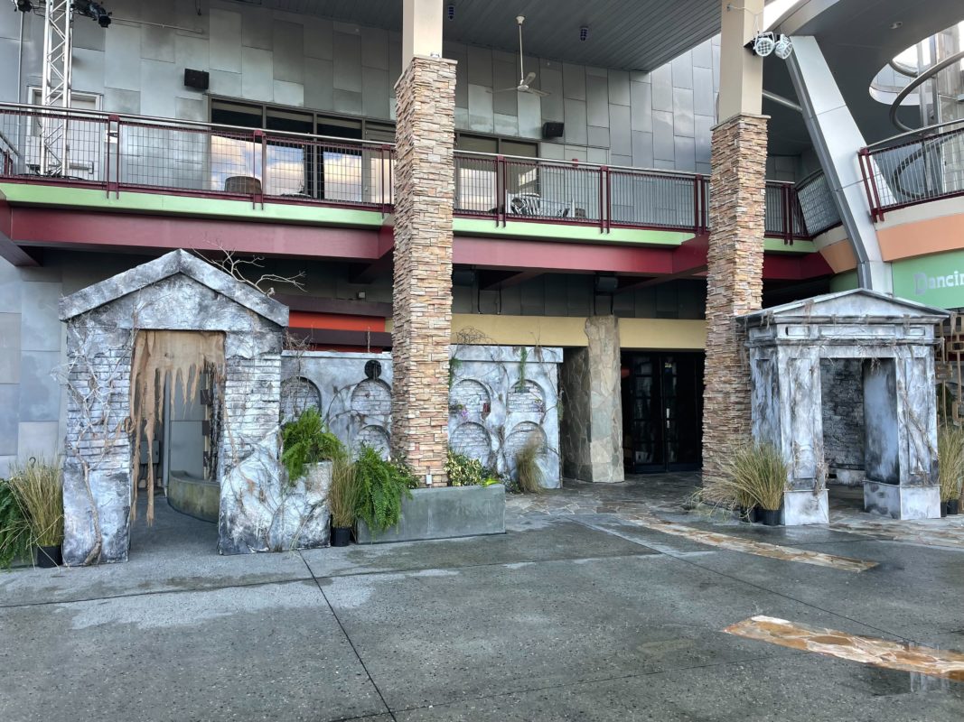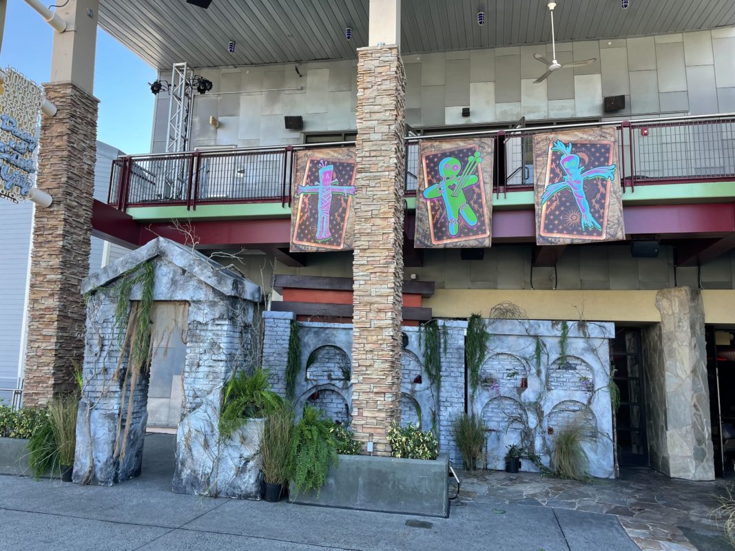 Now spooky archways and walls of fake stone are up outside the club. Tattered fabric hangs in one of the archways, and they are all covered in vines and overgrown plants.