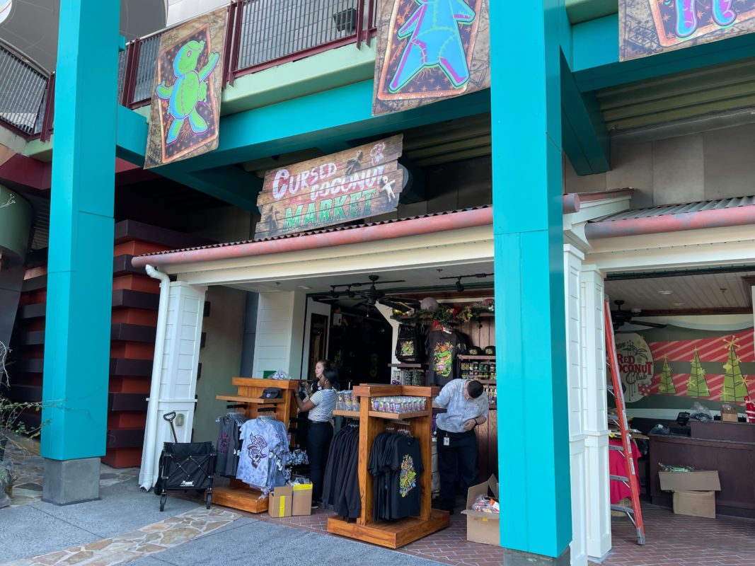 Banners also hang above the adjacent merchandise kiosk, which has Mardi Gras merchandise available. A Green & Red Coconut Club banner is still inside the store, but it will likely come down today.