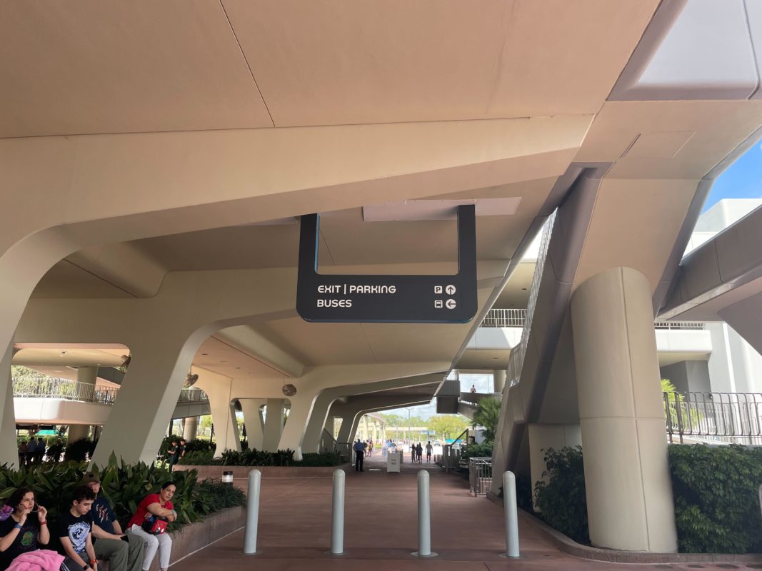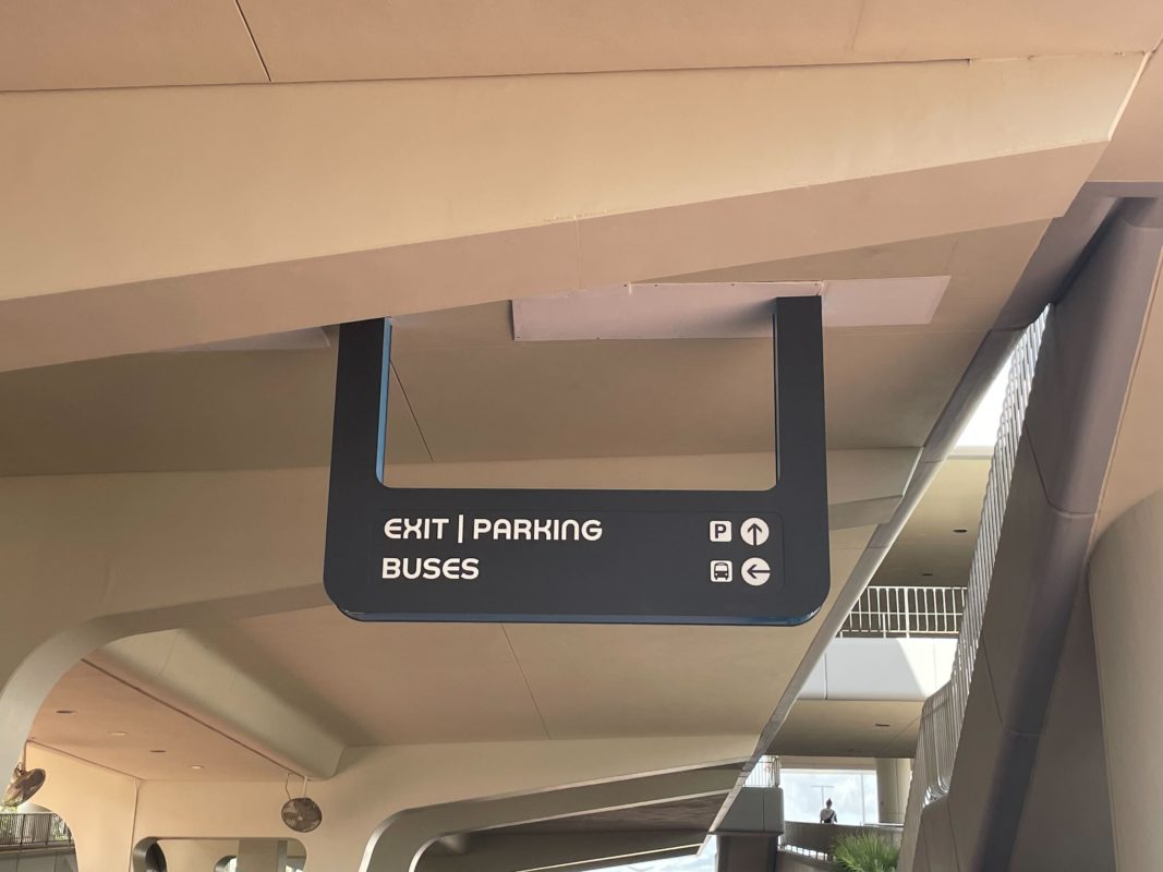 A new directional sign has been installed near the entrance to EPCOT, pointing exiting guests to parking and bus transportation.