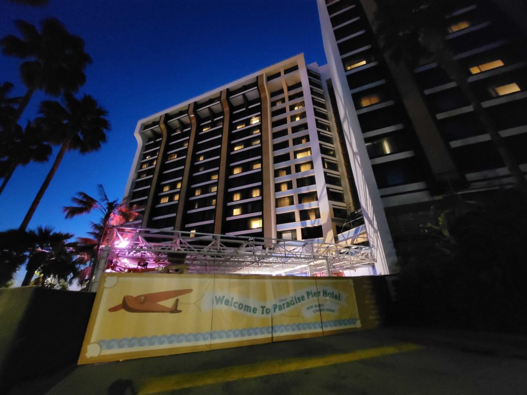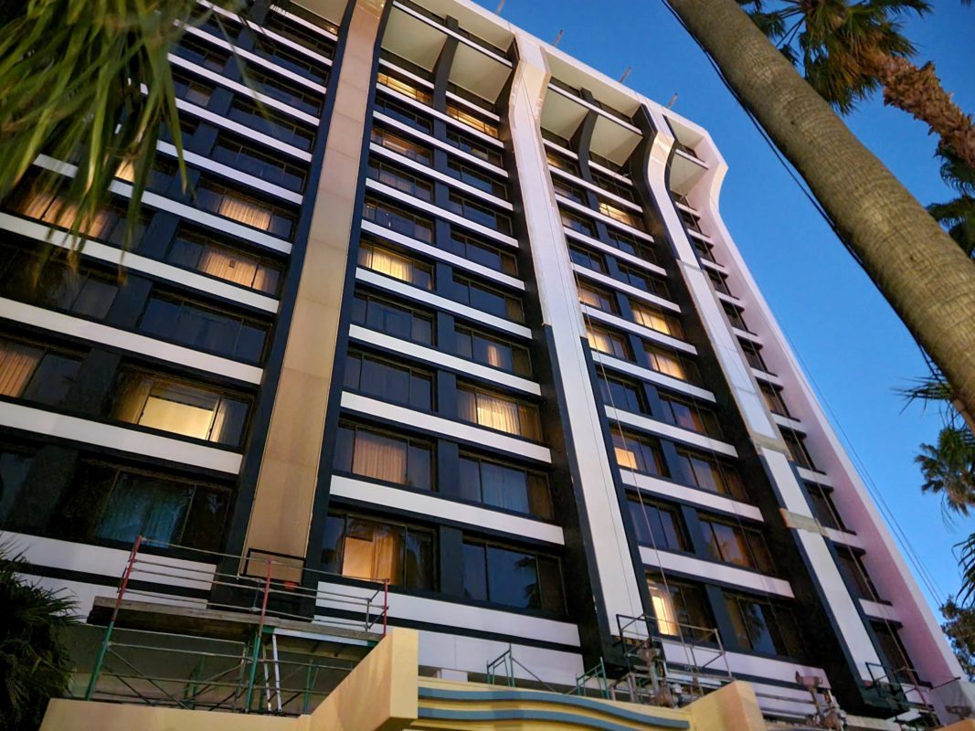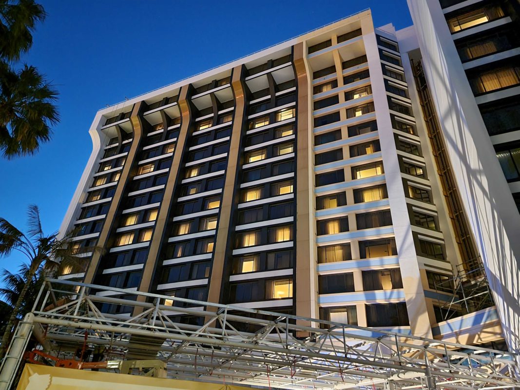 The exterior of the former Paradise Pier Hotel is starting to truly look different as painting work continues to transform the building into the upcoming Pixar Place Hotel.