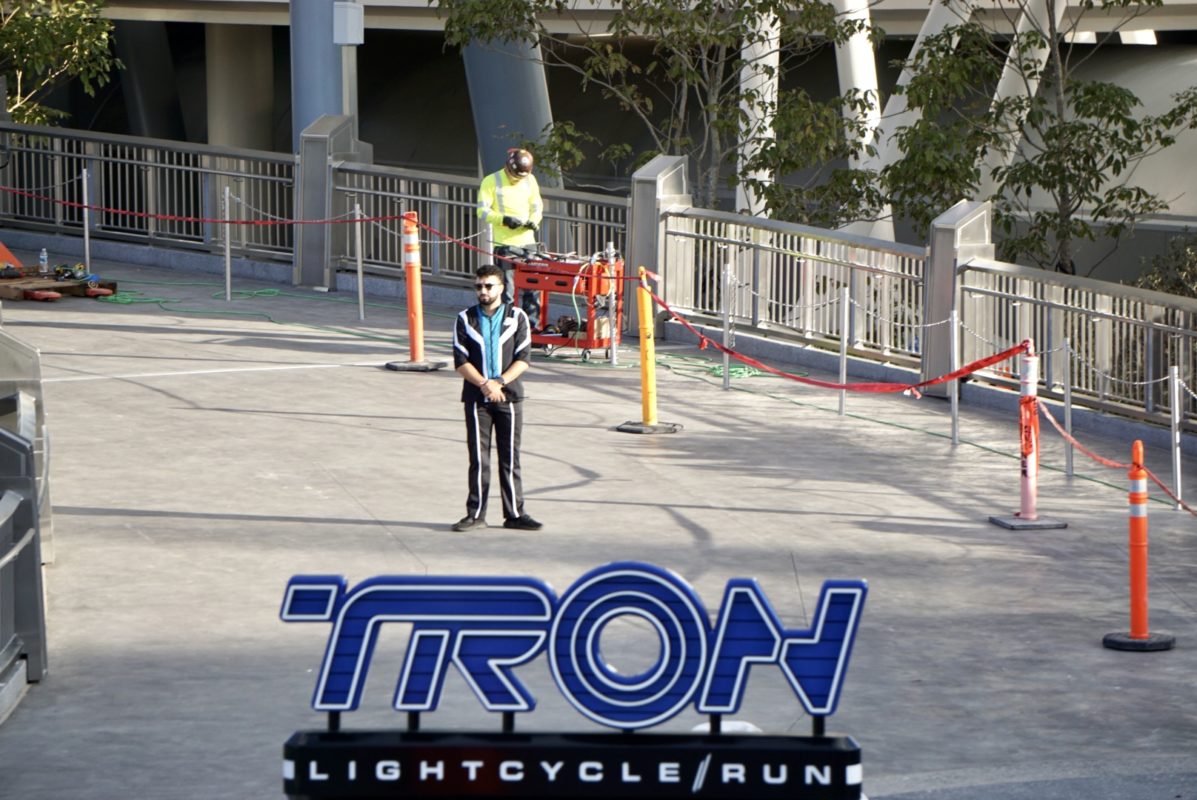 Next we took a ride on the PeopleMover to check on TRON Lightcycle / Run construction. We spotted a TRON Cast Member wearing their uniform at the walkway entrance.